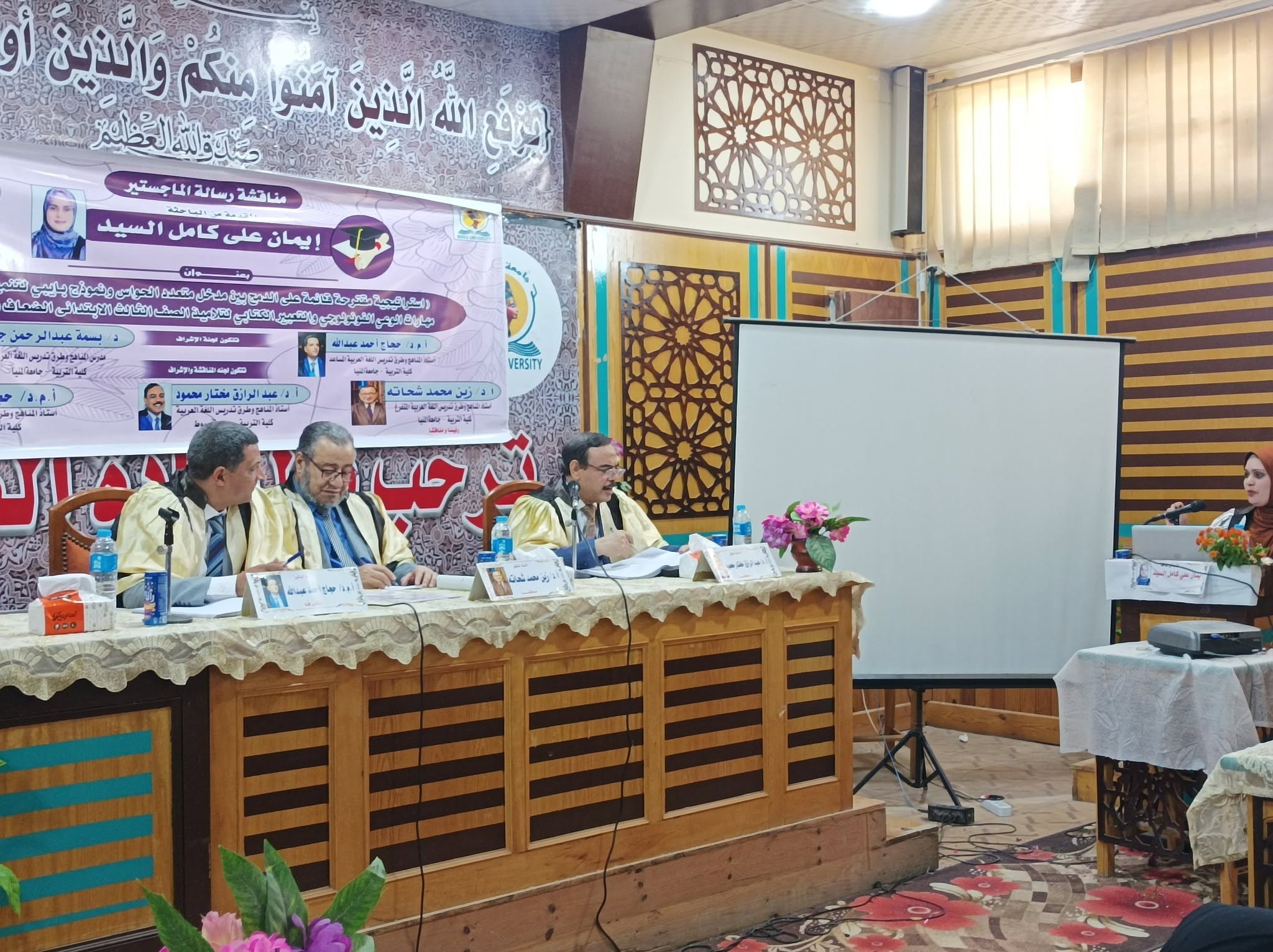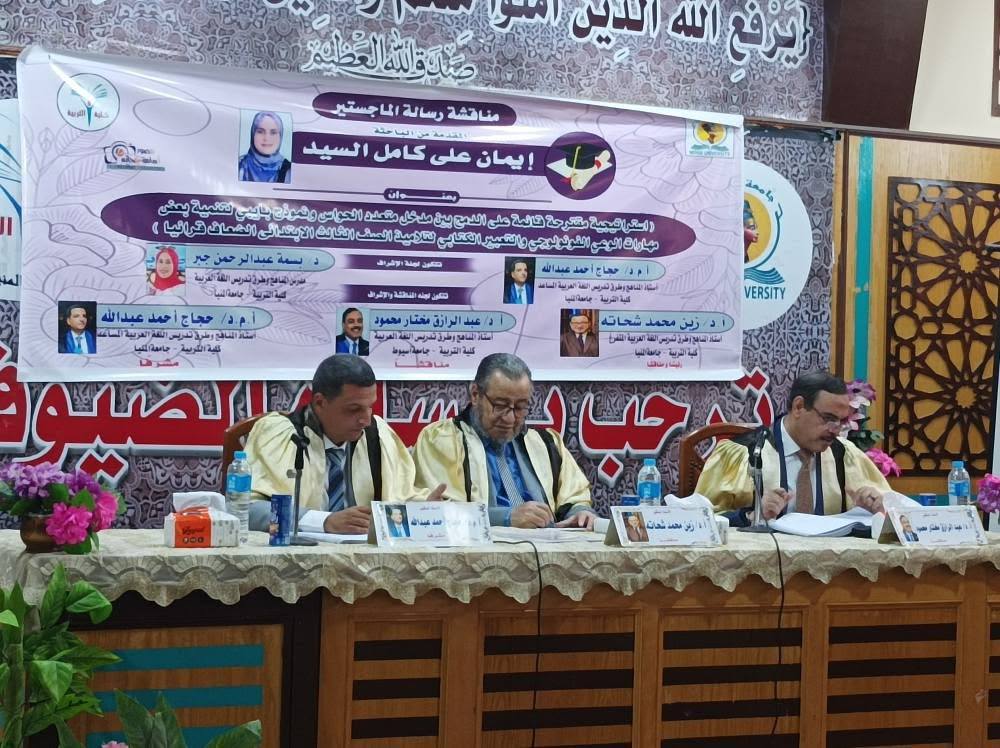 عميد تربية المنيا يستقبل لجنة المناقشة والحكم لرسالة الماجستير المقدمة من الباحثة/ إيمان علي كامل السيد "قسم مناهج وطرق تدريس اللغة العربية"