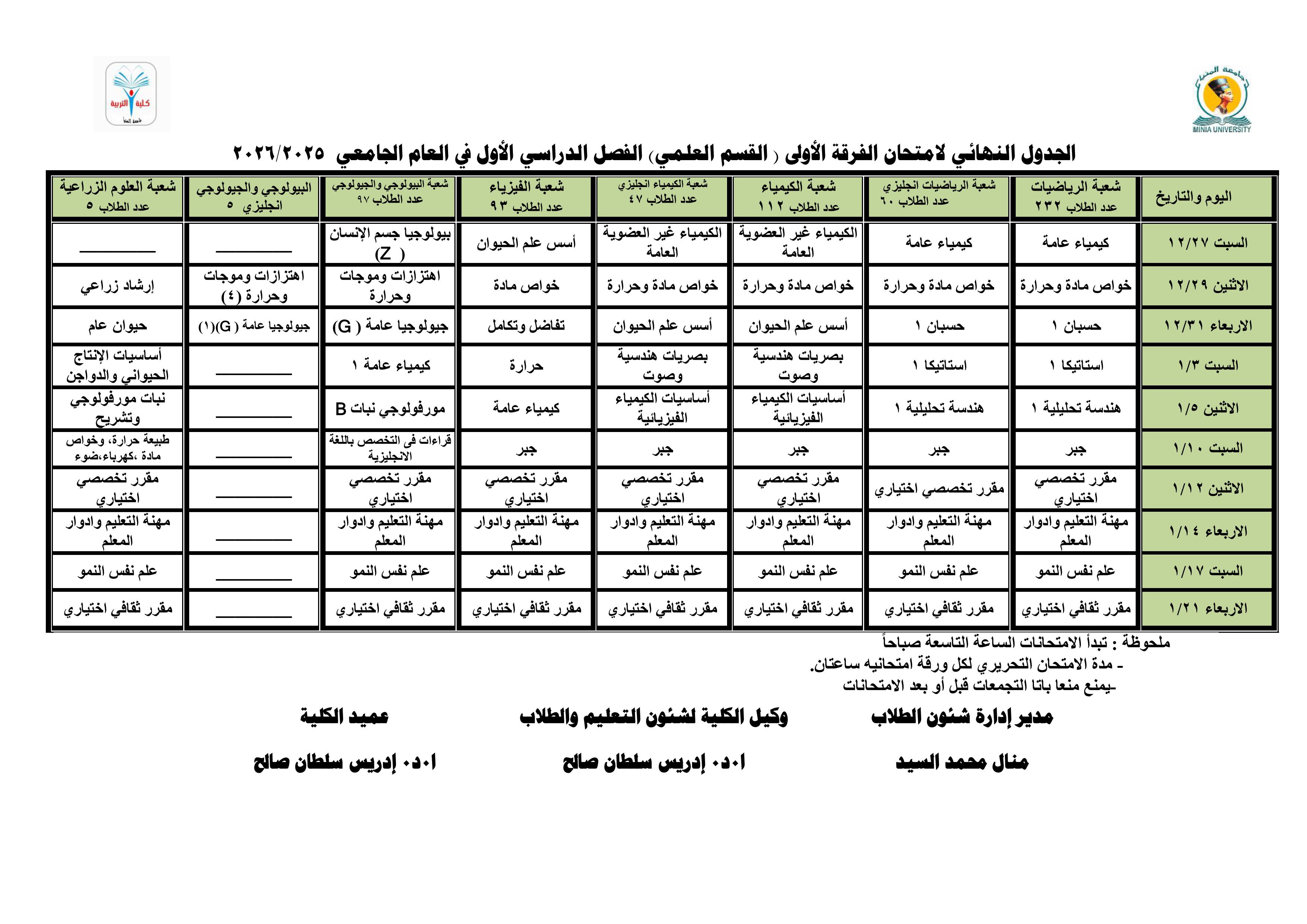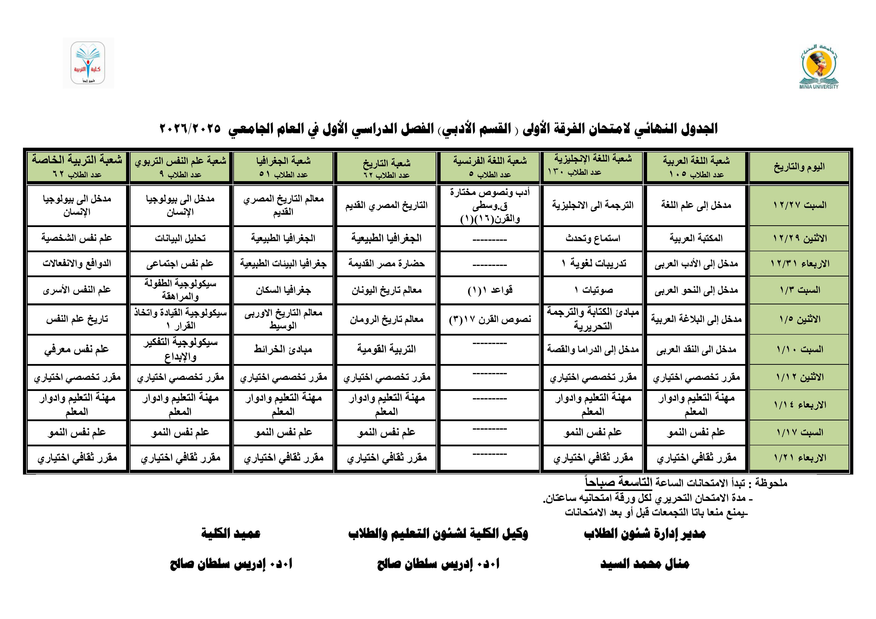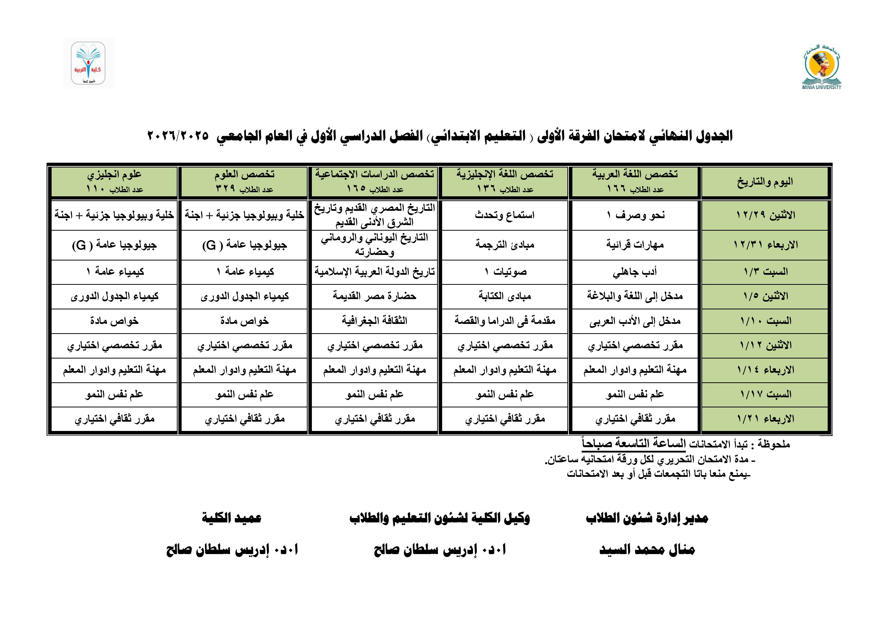 جدول امتحانات الفرقة الأولى للفصل الدراسي الأول للعام الجامعي ٢٠٢٥ / ٢٠٢٦.