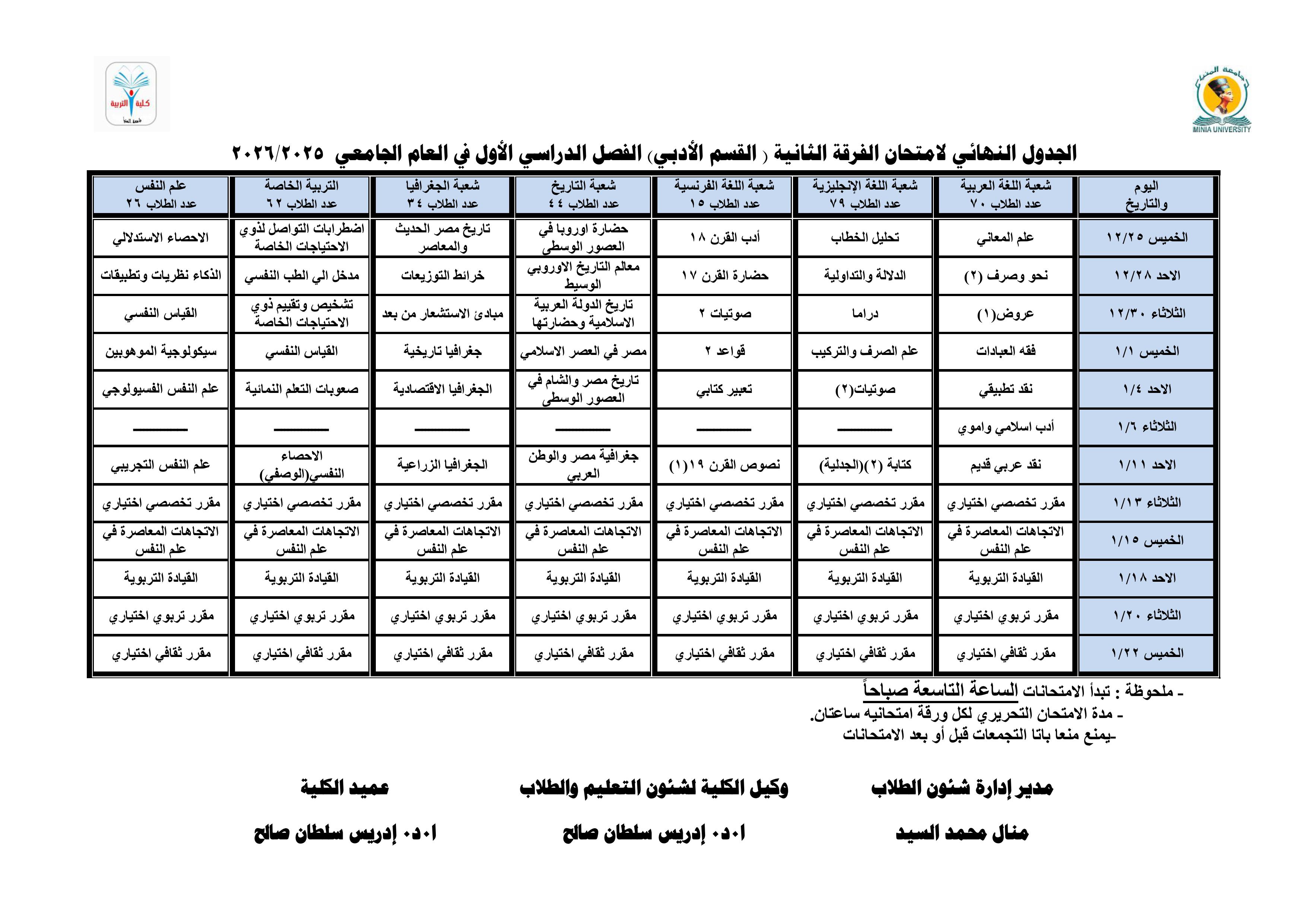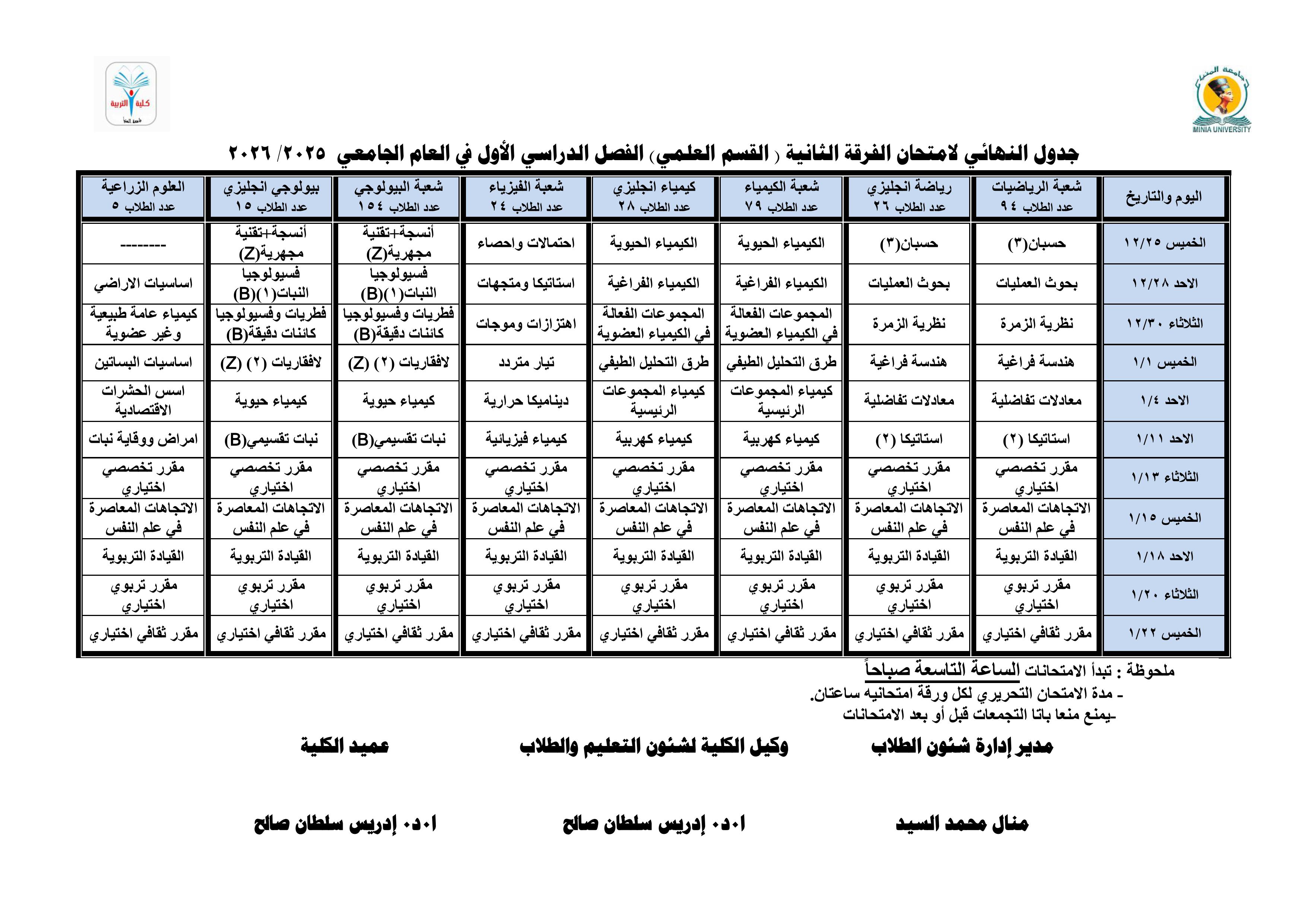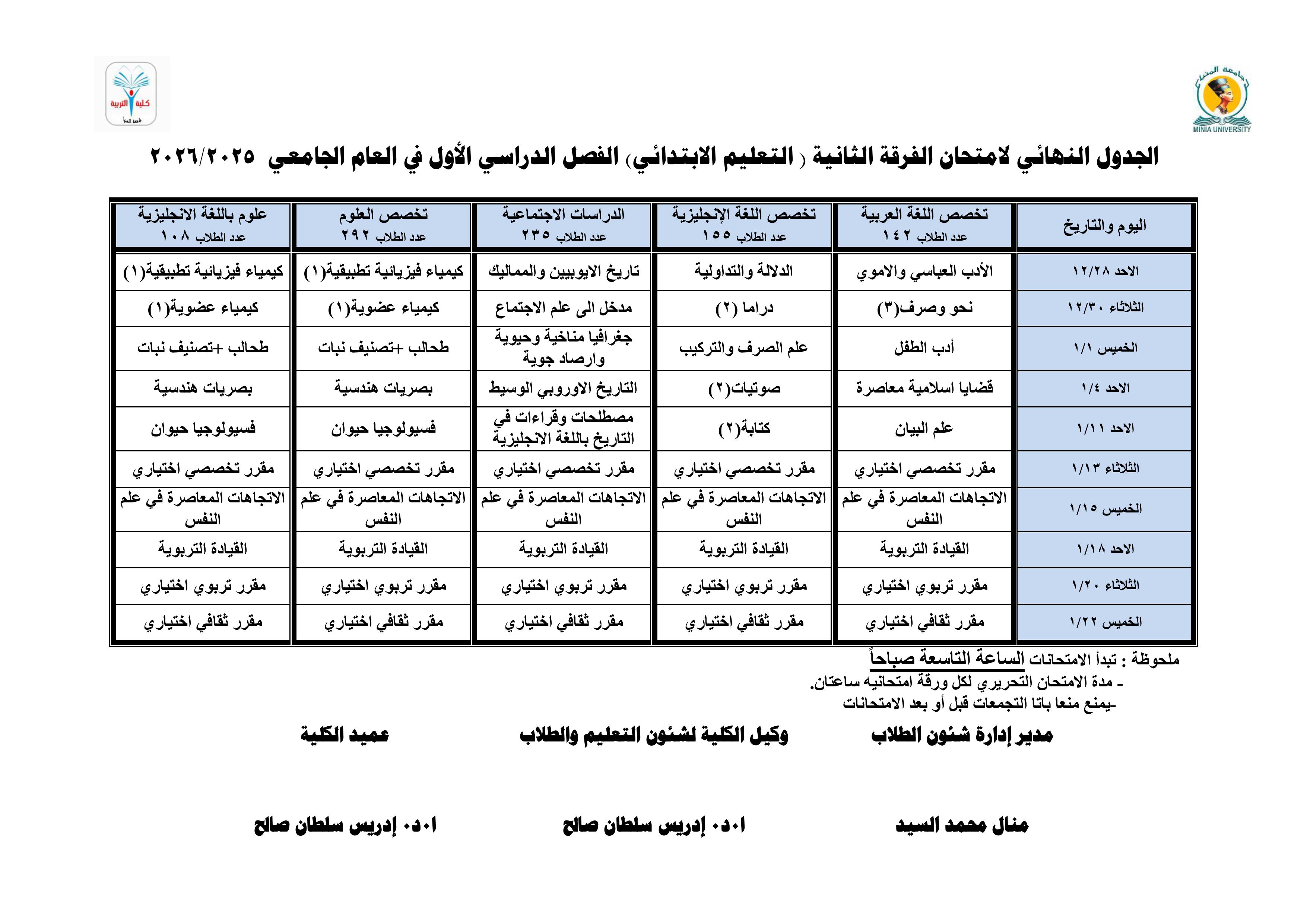 جدول امتحانات الفرقة الثانية للفصل الدراسي الأول للعام الجامعي ٢٠٢٥ / ٢٠٢٦.