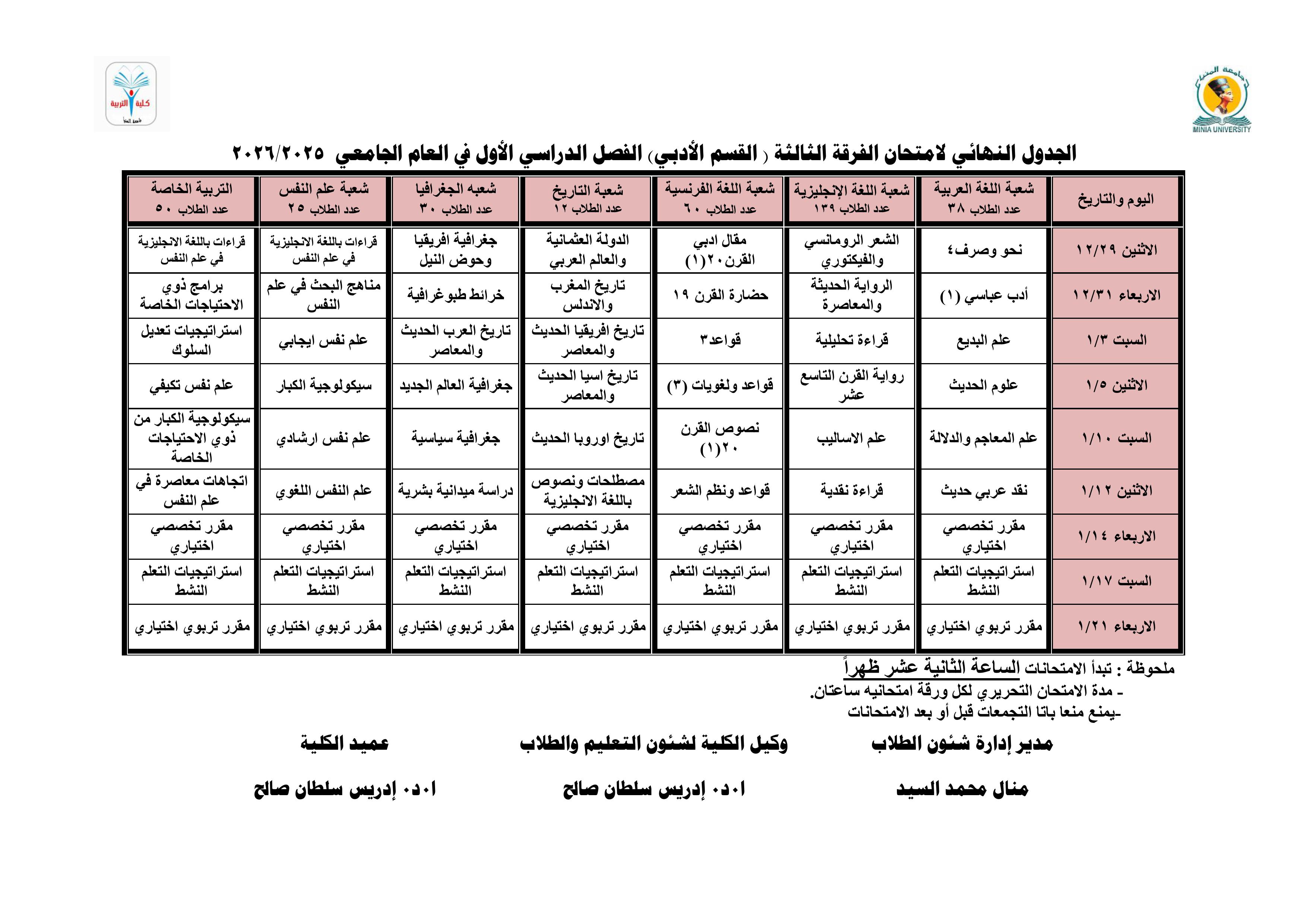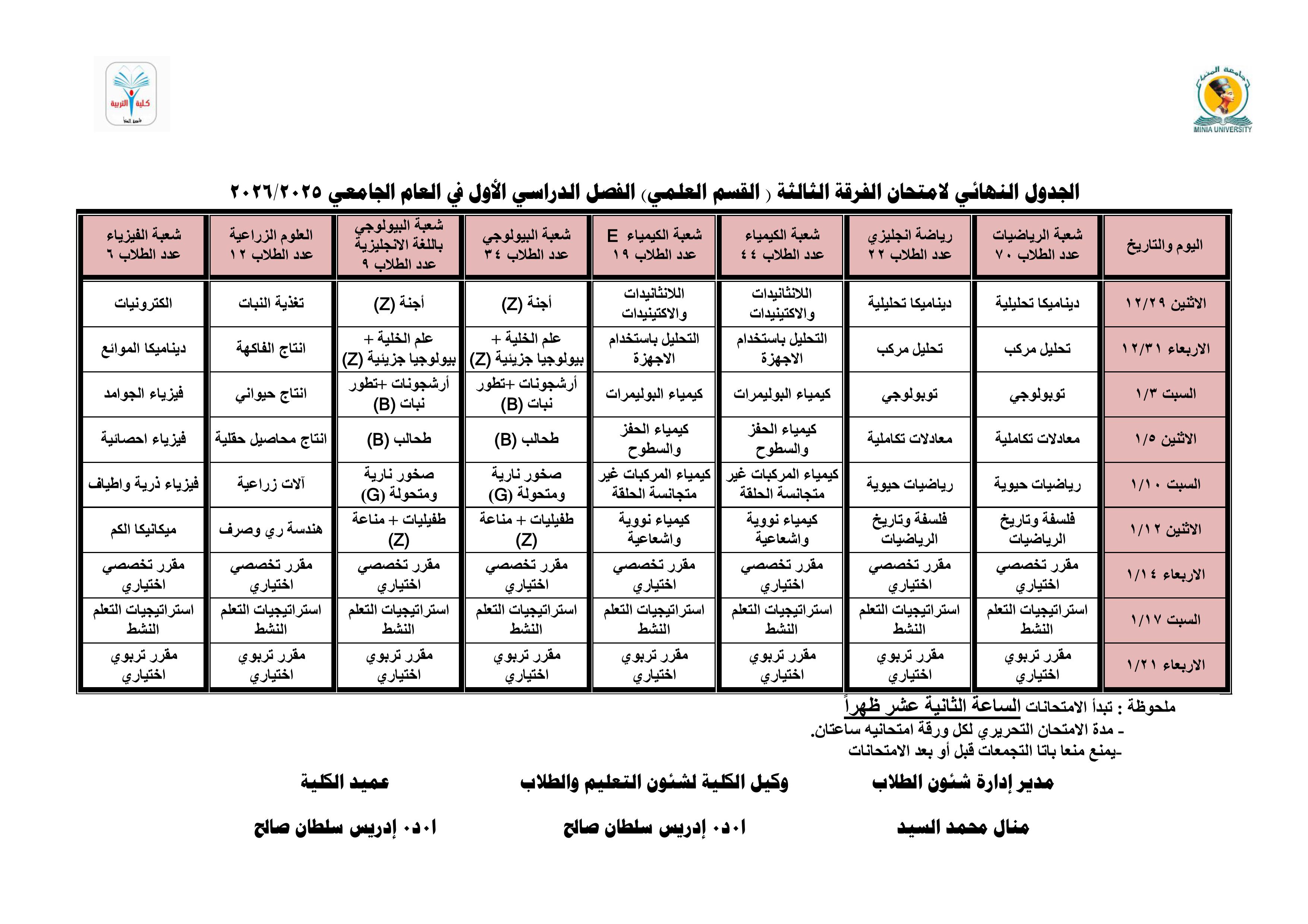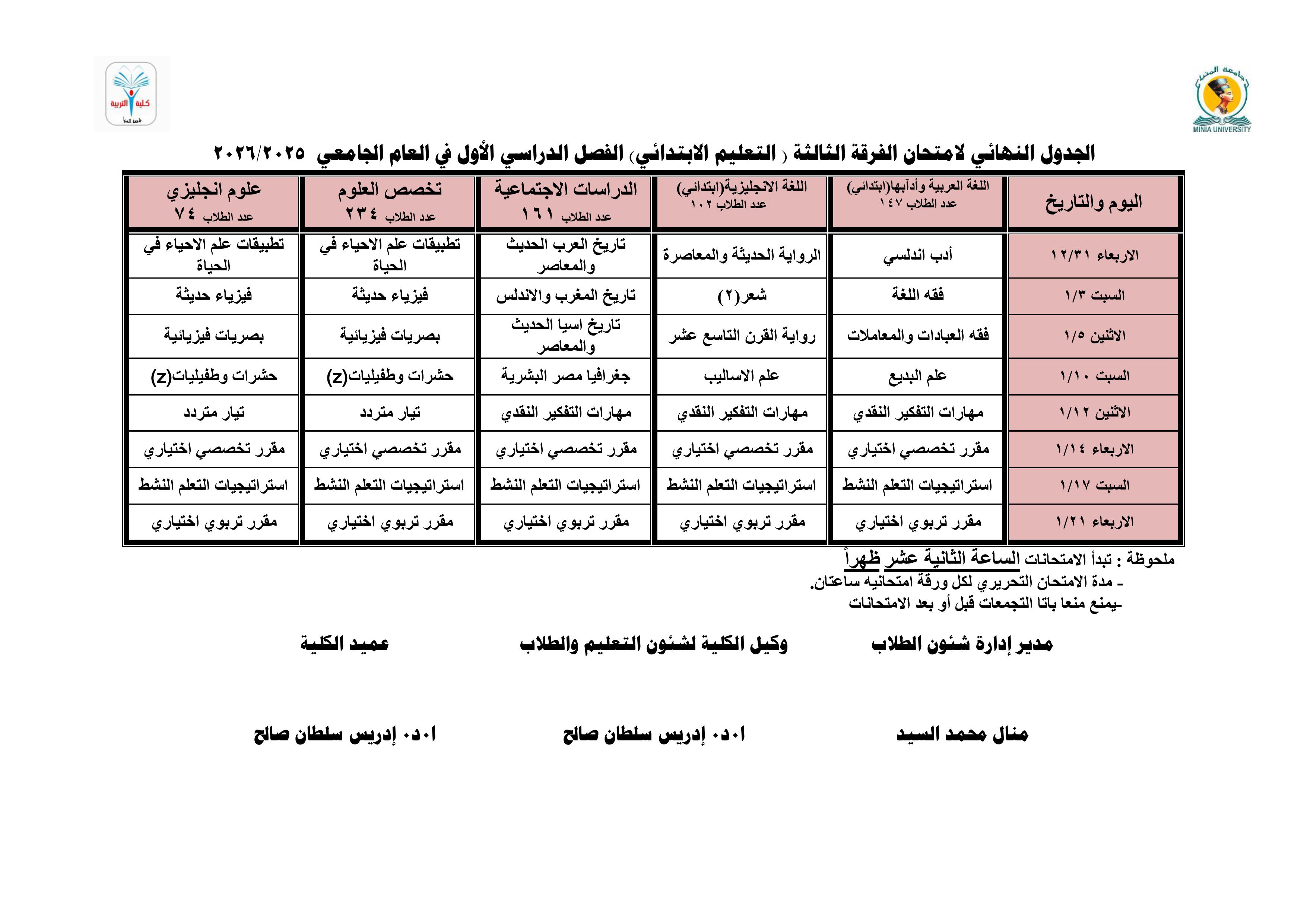 جدول امتحانات الفرقة الثالثة للفصل الدراسي الأول للعام الجامعي ٢٠٢٥ / ٢٠٢٦.
