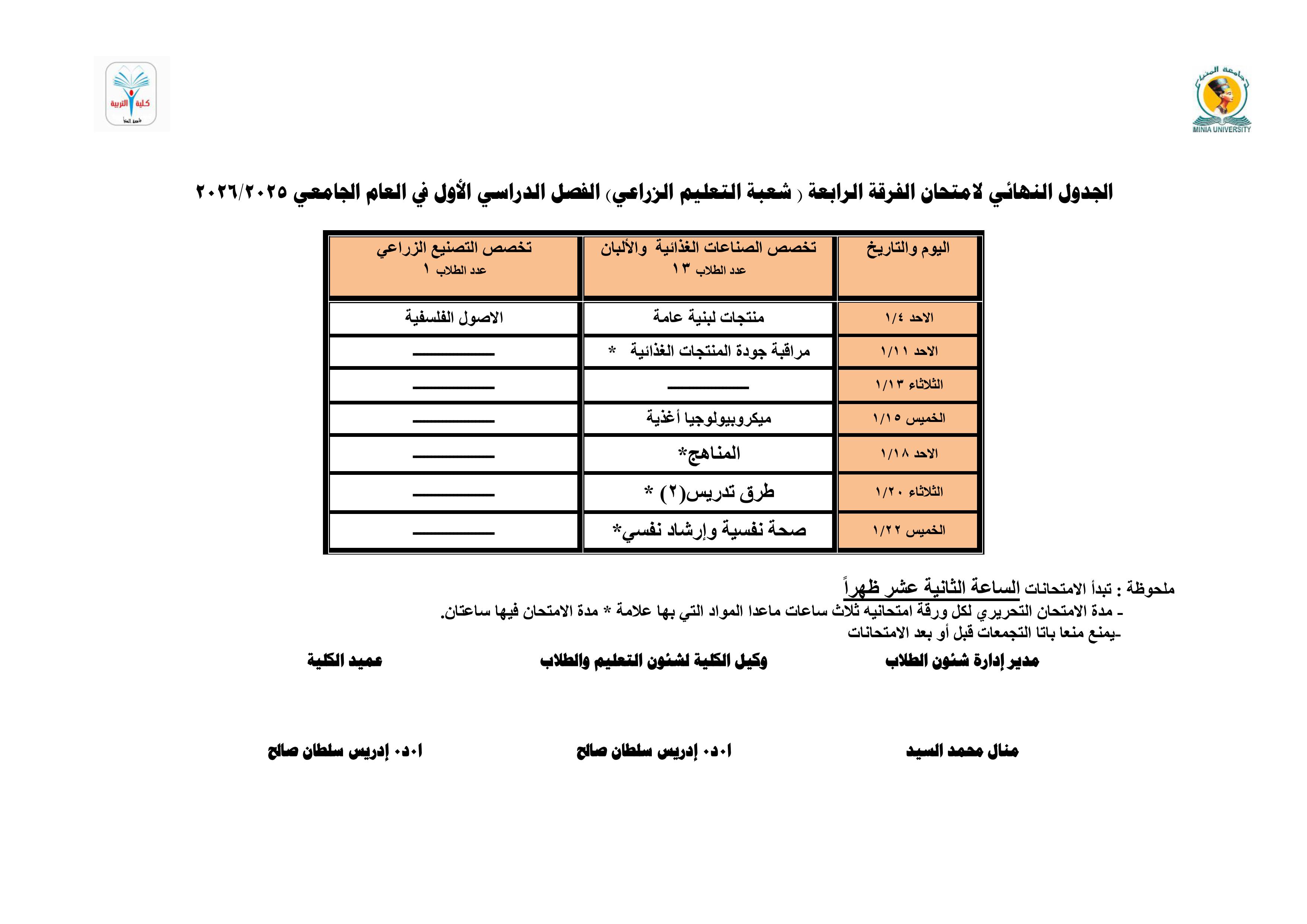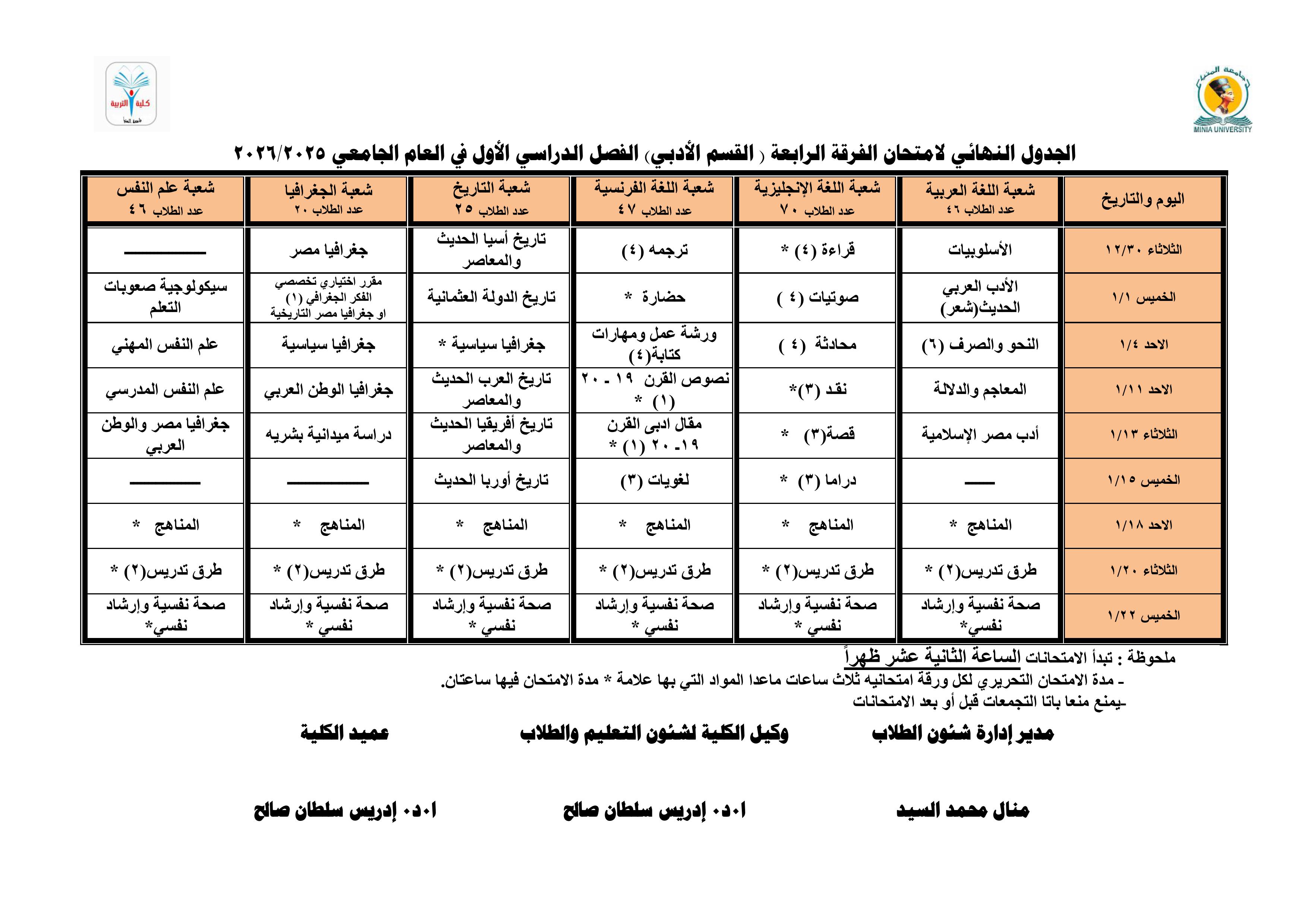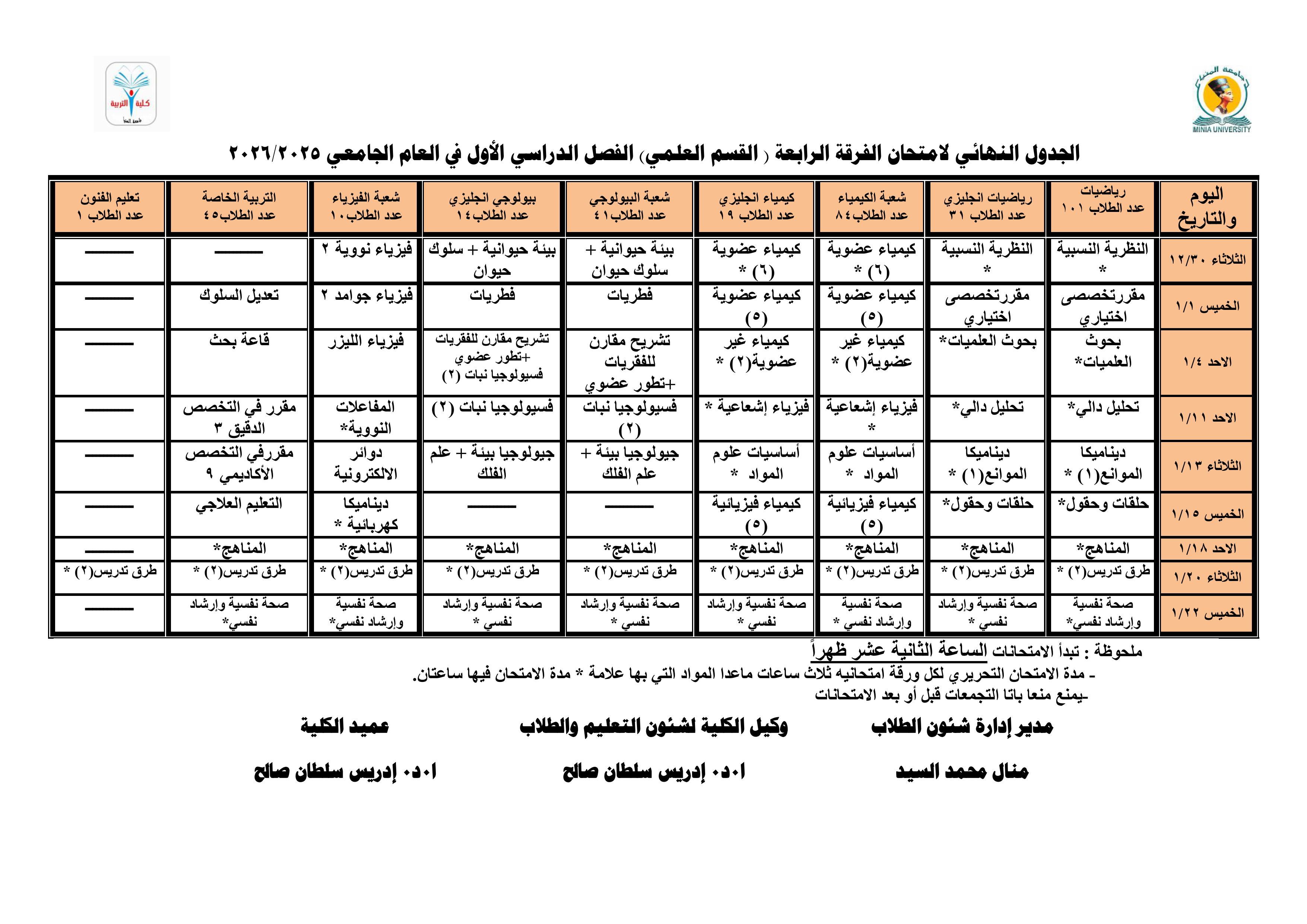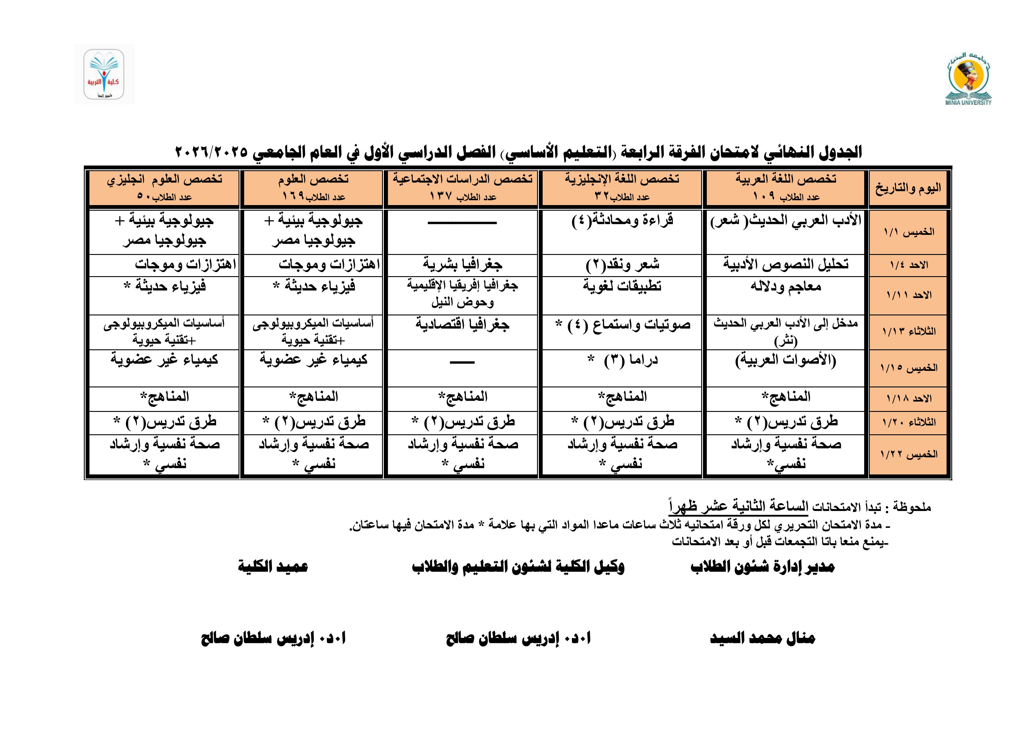 جدول امتحانات الفرقة الرابعة للفصل الدراسي الأول للعام الجامعي ٢٠٢٥ / ٢٠٢٦.