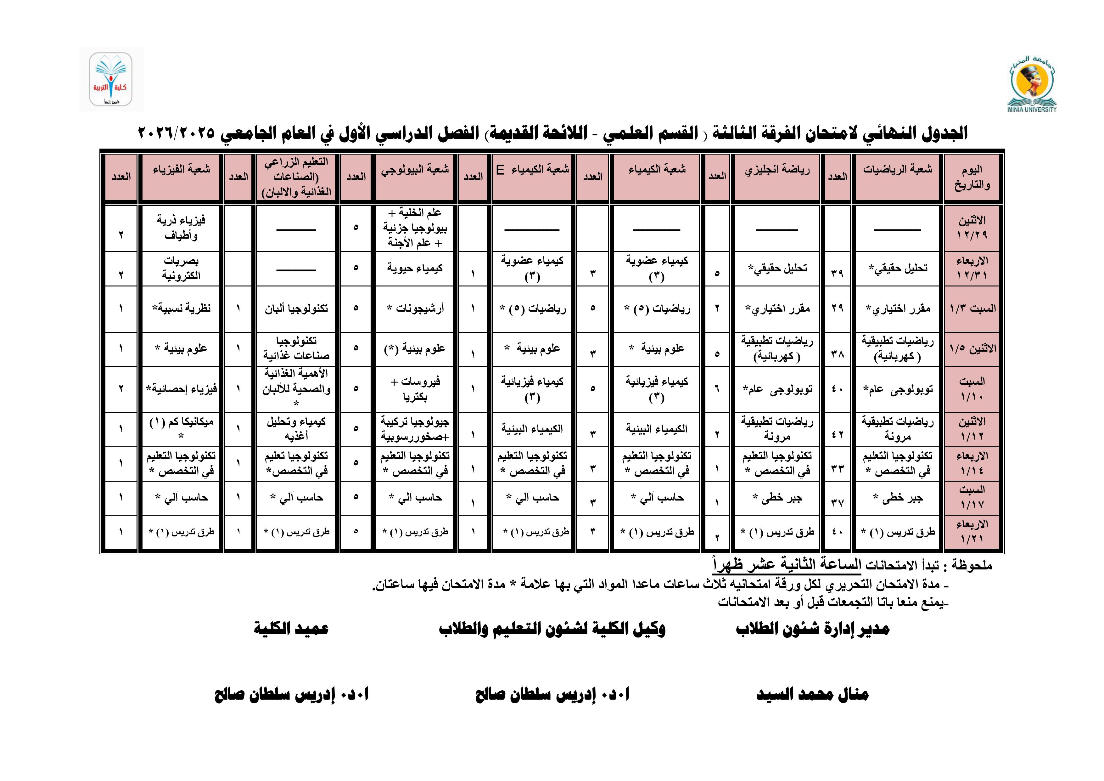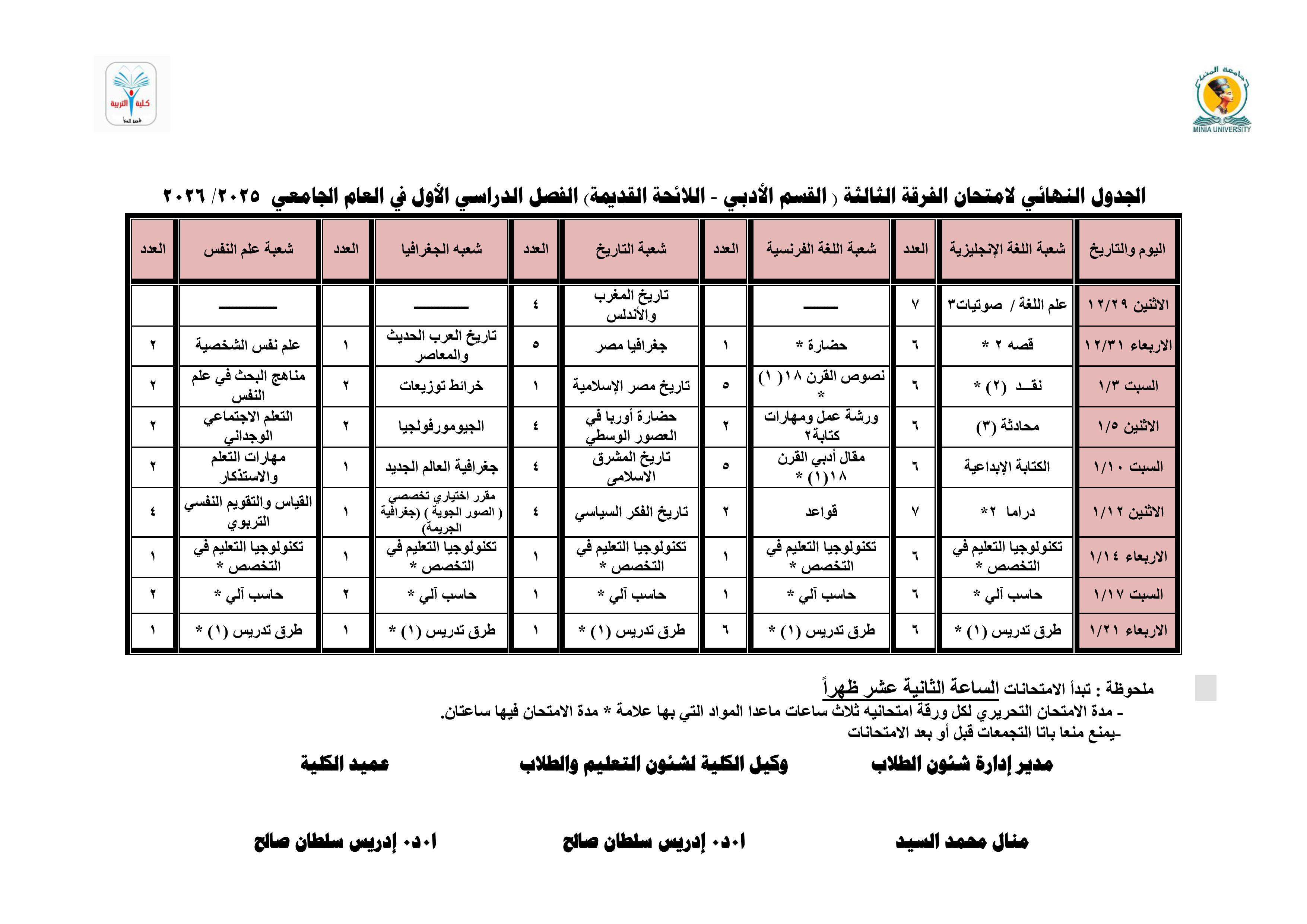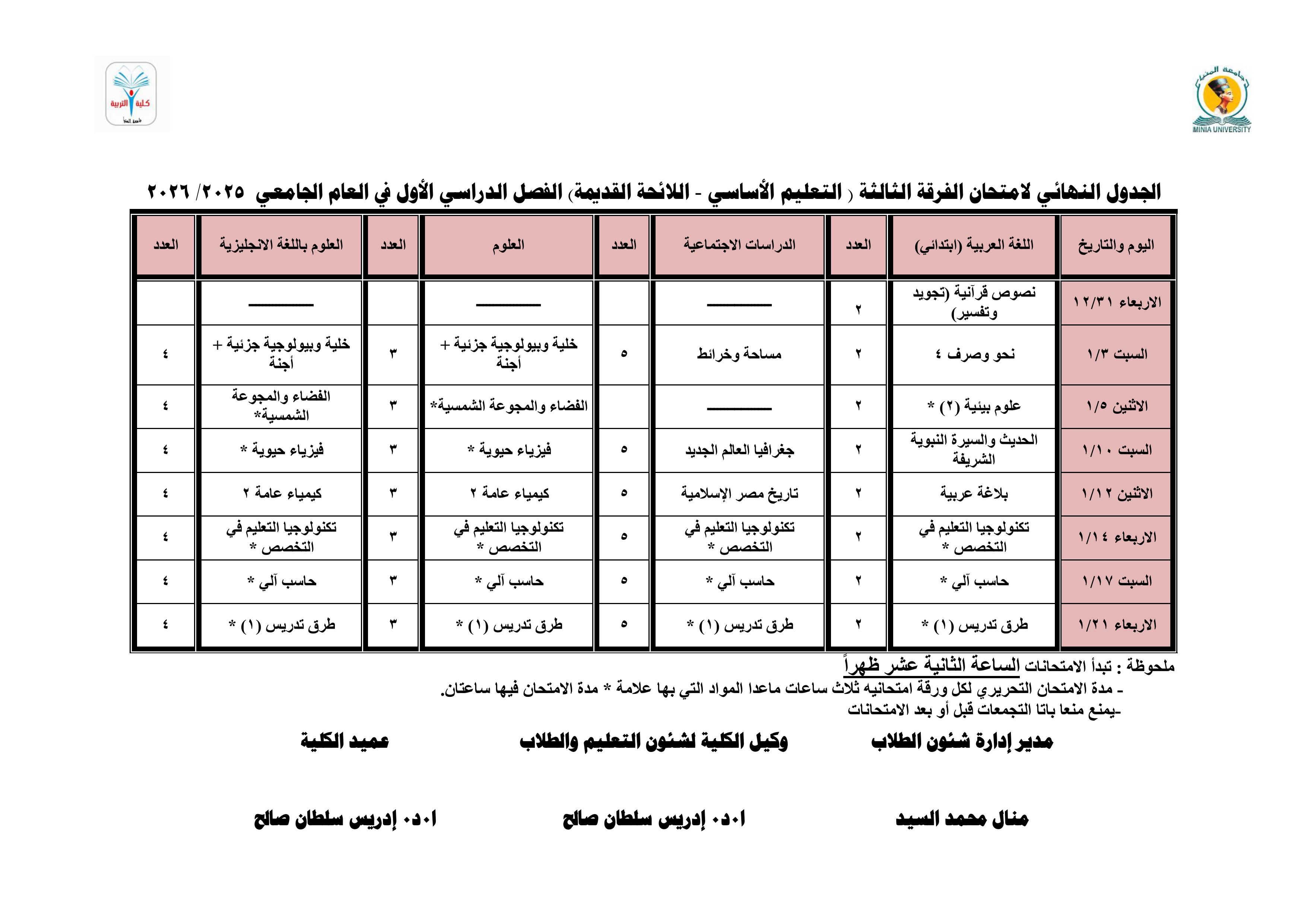 جدول امتحانات الفرقة الثالثة (لائحة ٢٠٠٨ نظام السنوات الدراسية) للفصل الدراسي الأول للعام الجامعي ٢٠٢٥ / ٢٠٢٦