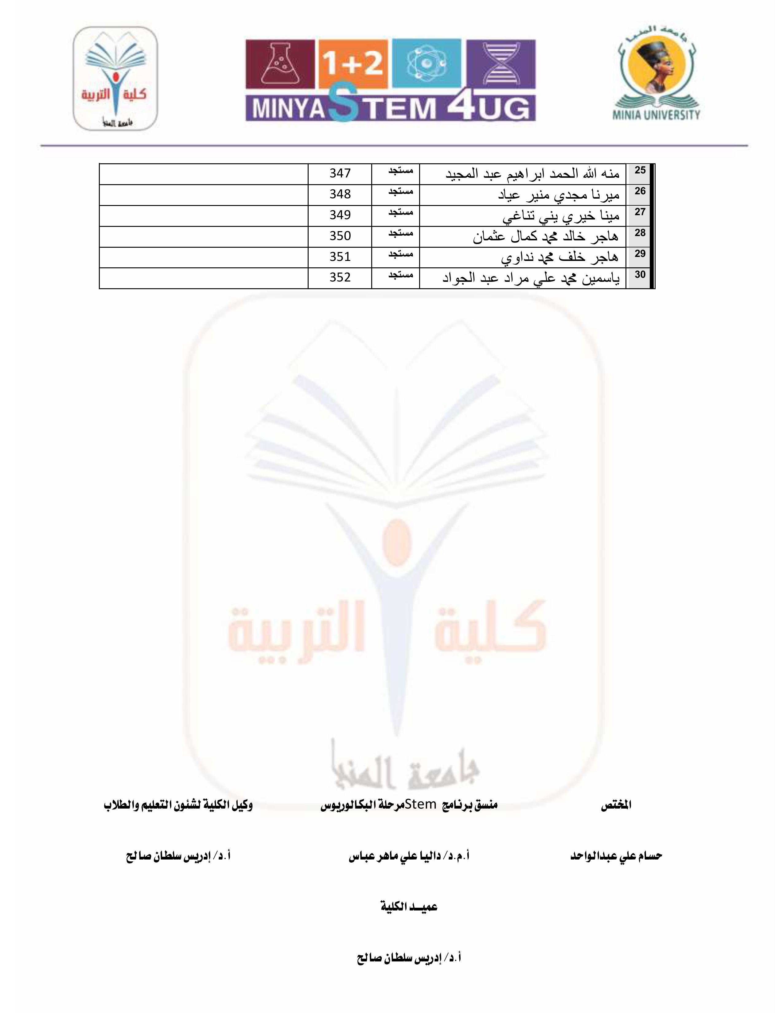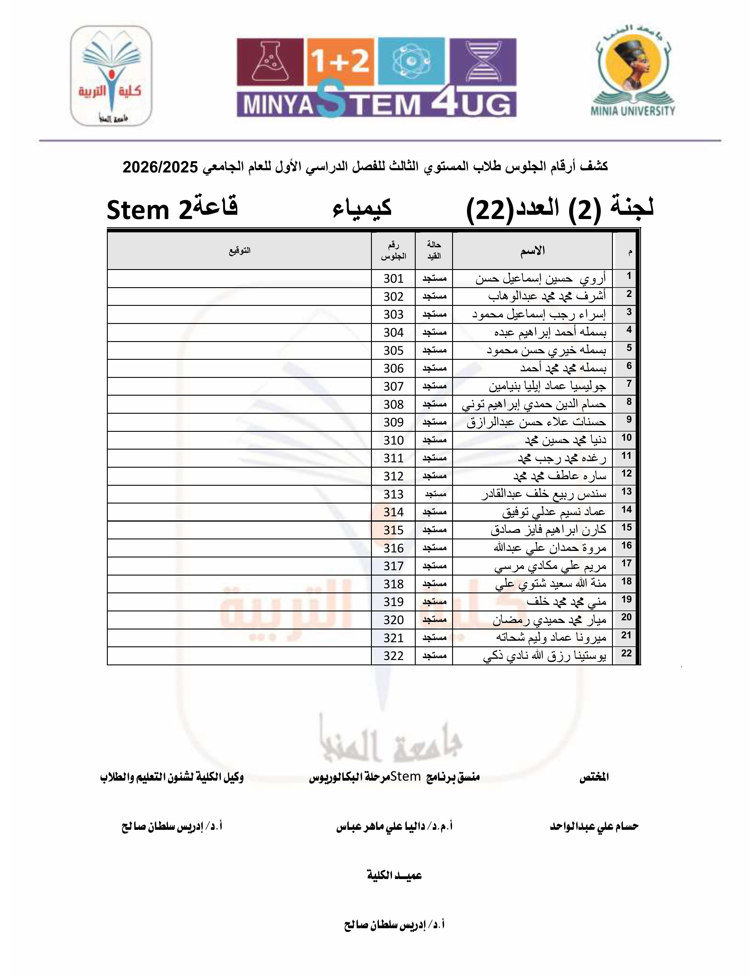 الأبناء الأعزاء طلاب المستوى الثالث STEM بكلية التربية، مرفق لكم رابط أرقام الجلوس وأماكن اللجان لامتحانات الفصل الدراسي الأول للعام ٢٠٢٥ / ٢٠٢٦م.