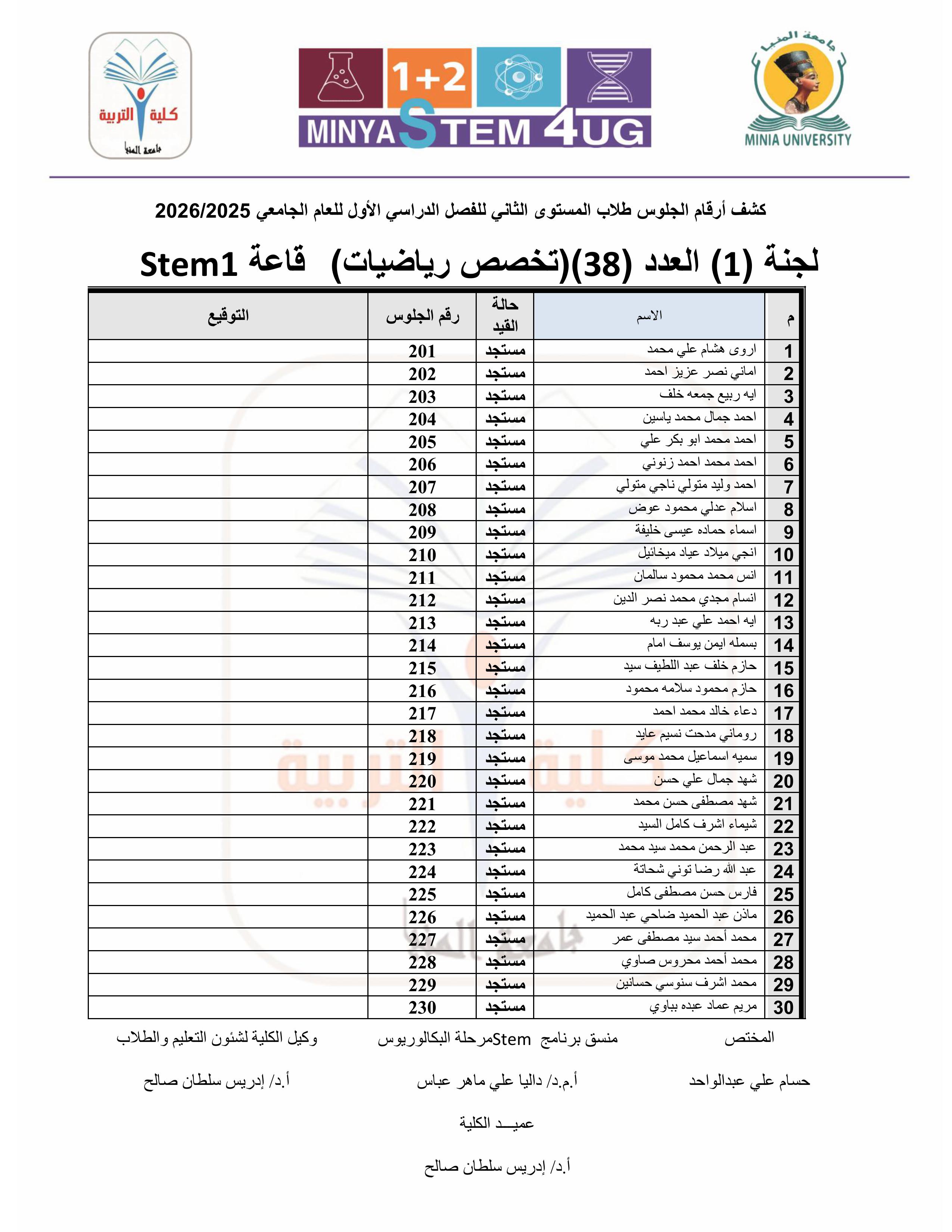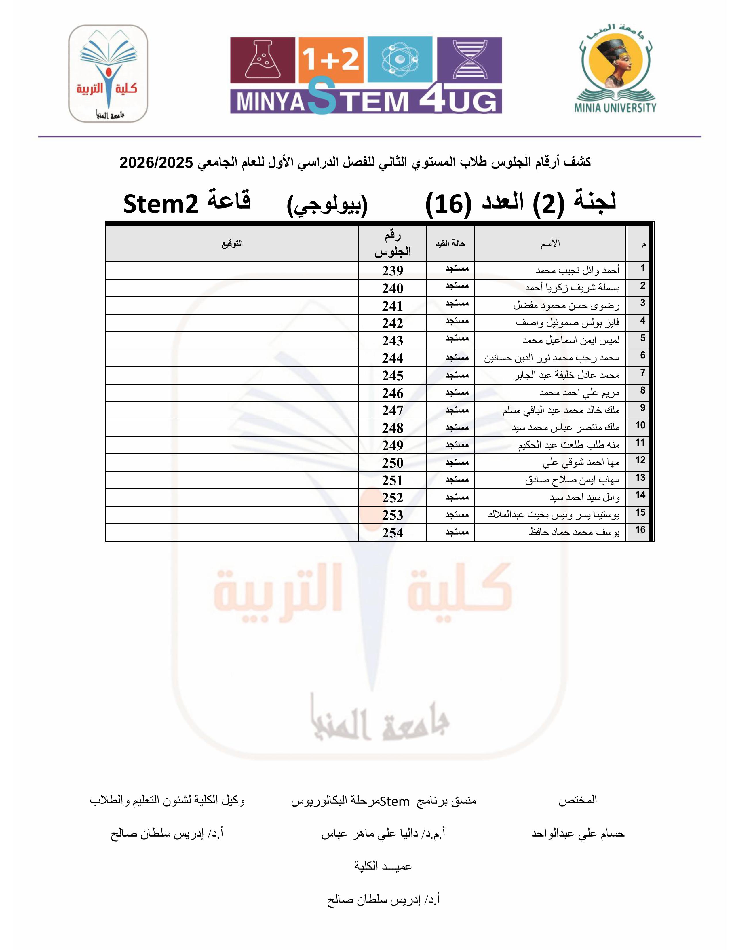 أرقام جلوس وأماكن لجان امتحانات المستوى الثانى STEM للفصل الدراسي الأول ٢٠٢٥ / ٢٠٢٦م