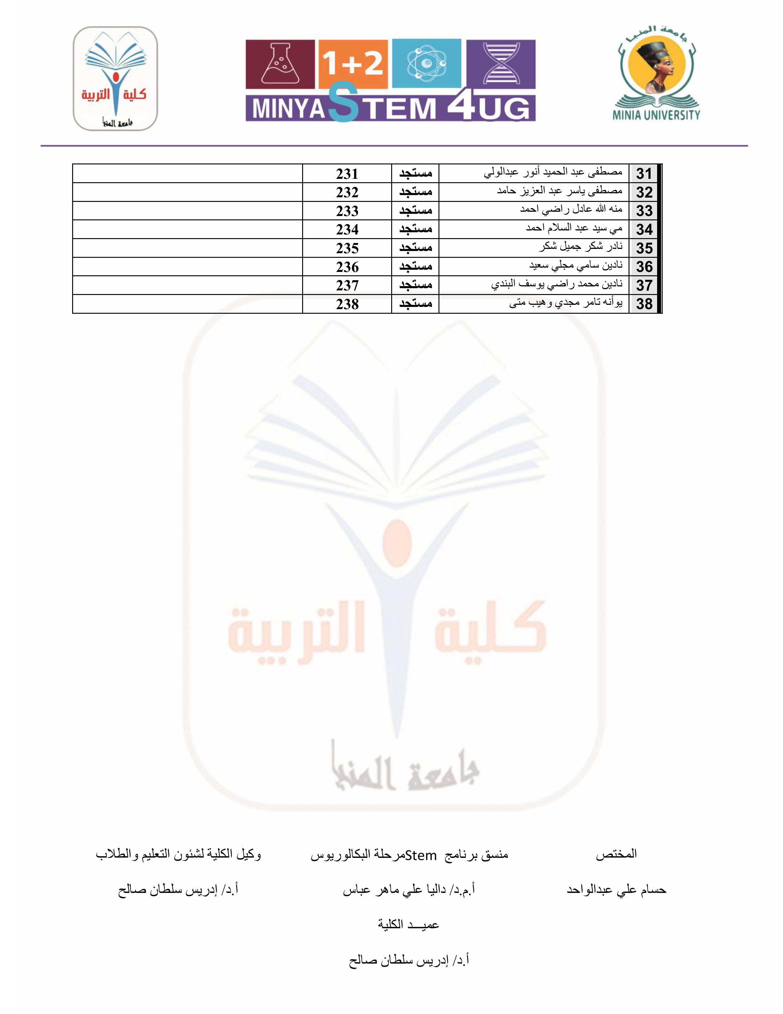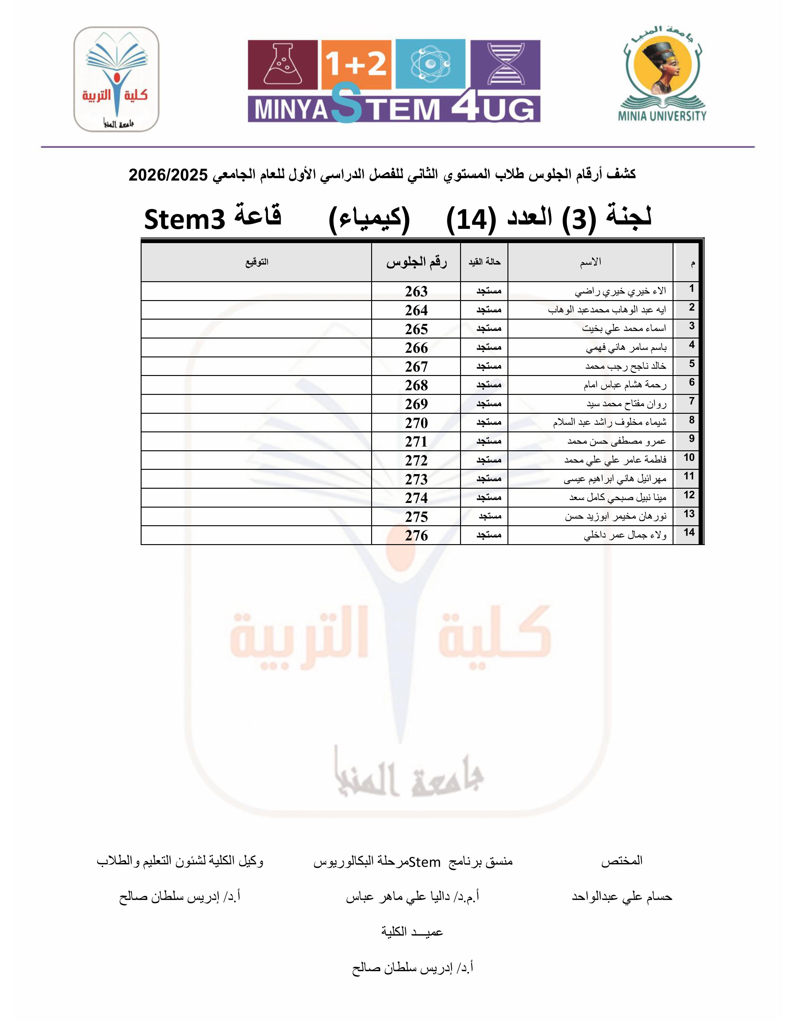 الأبناء الأعزاء طلاب المستوى الثانى STEM بكلية التربية، مرفق لكم رابط أرقام الجلوس وأماكن اللجان لامتحانات الفصل الدراسي الأول للعام ٢٠٢٥ / ٢٠٢٦م.