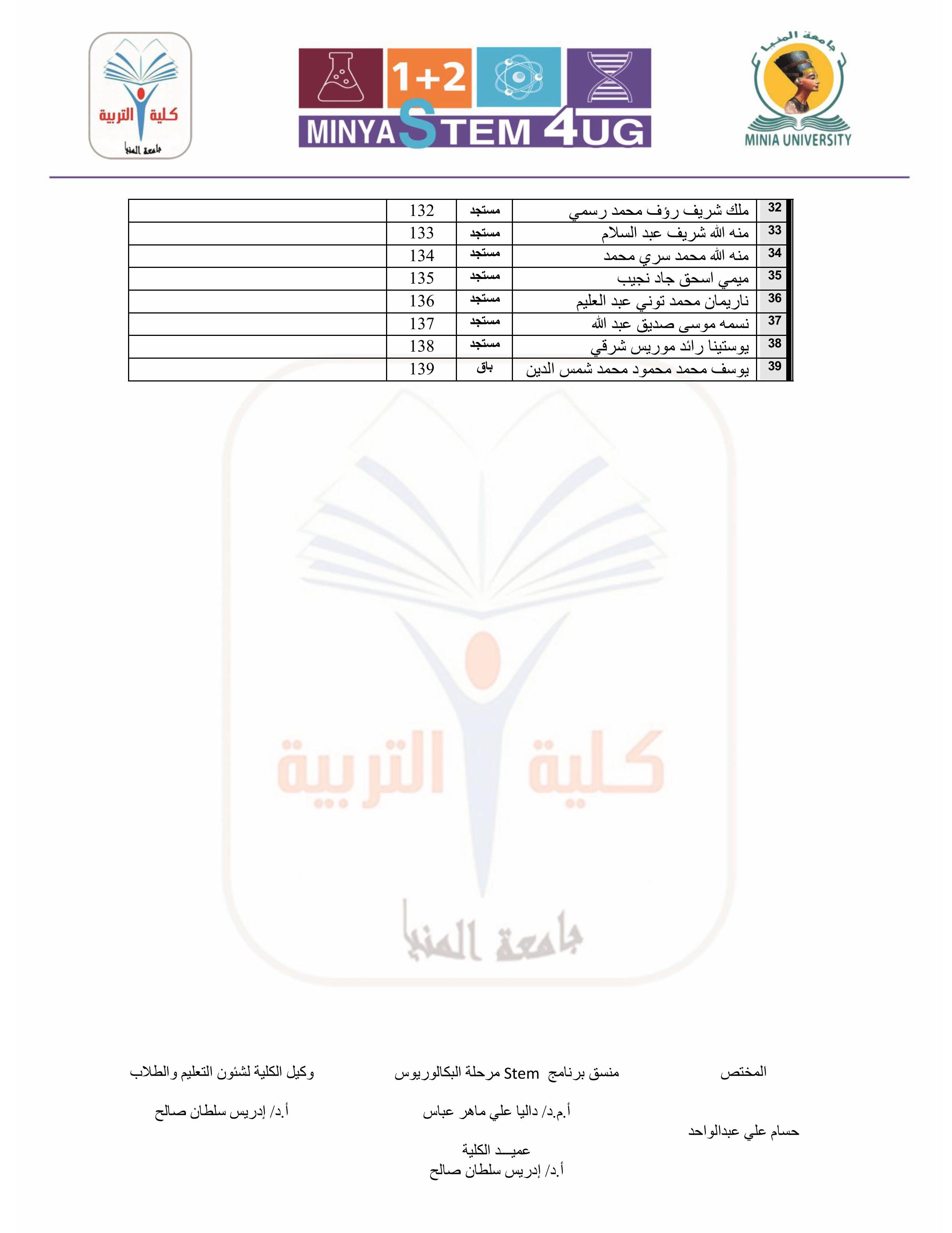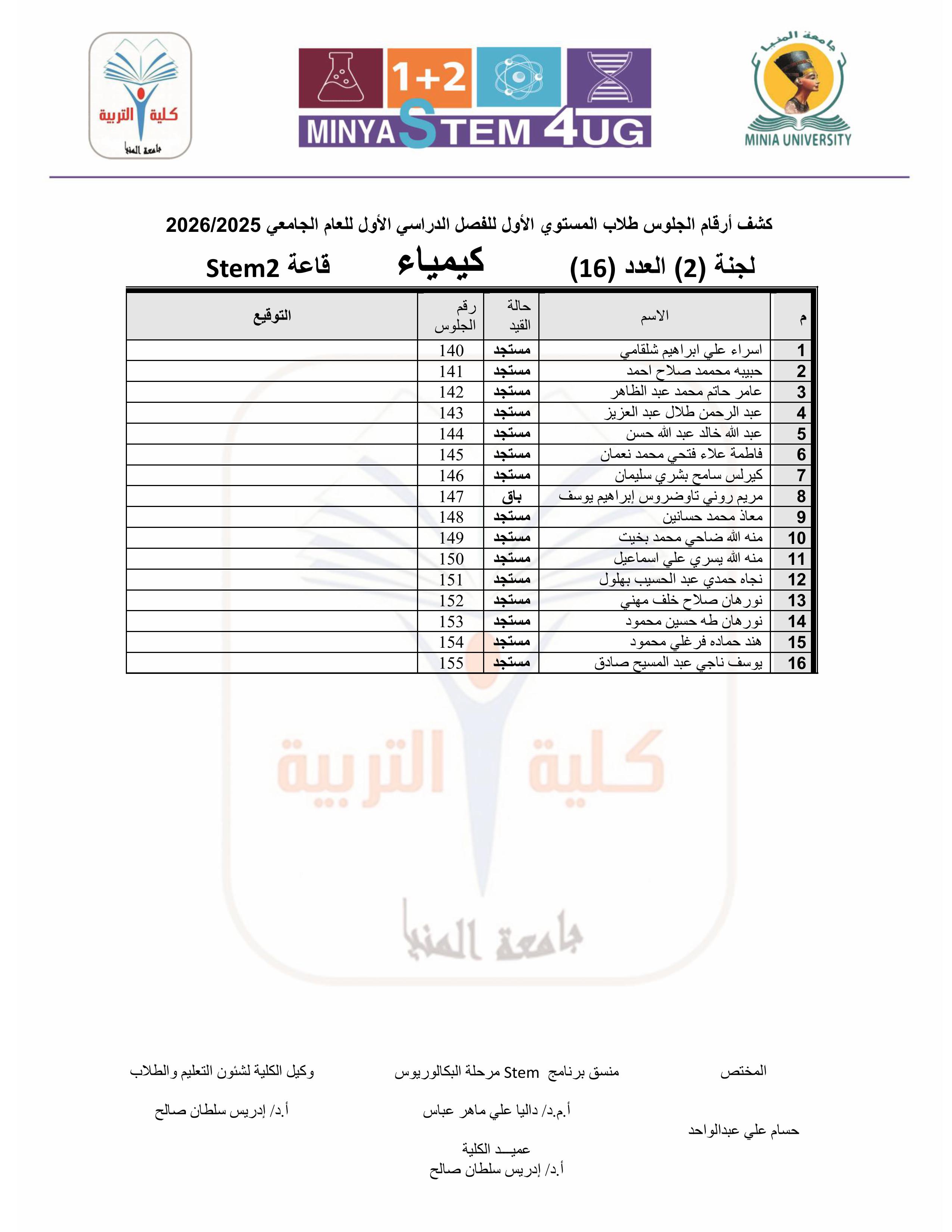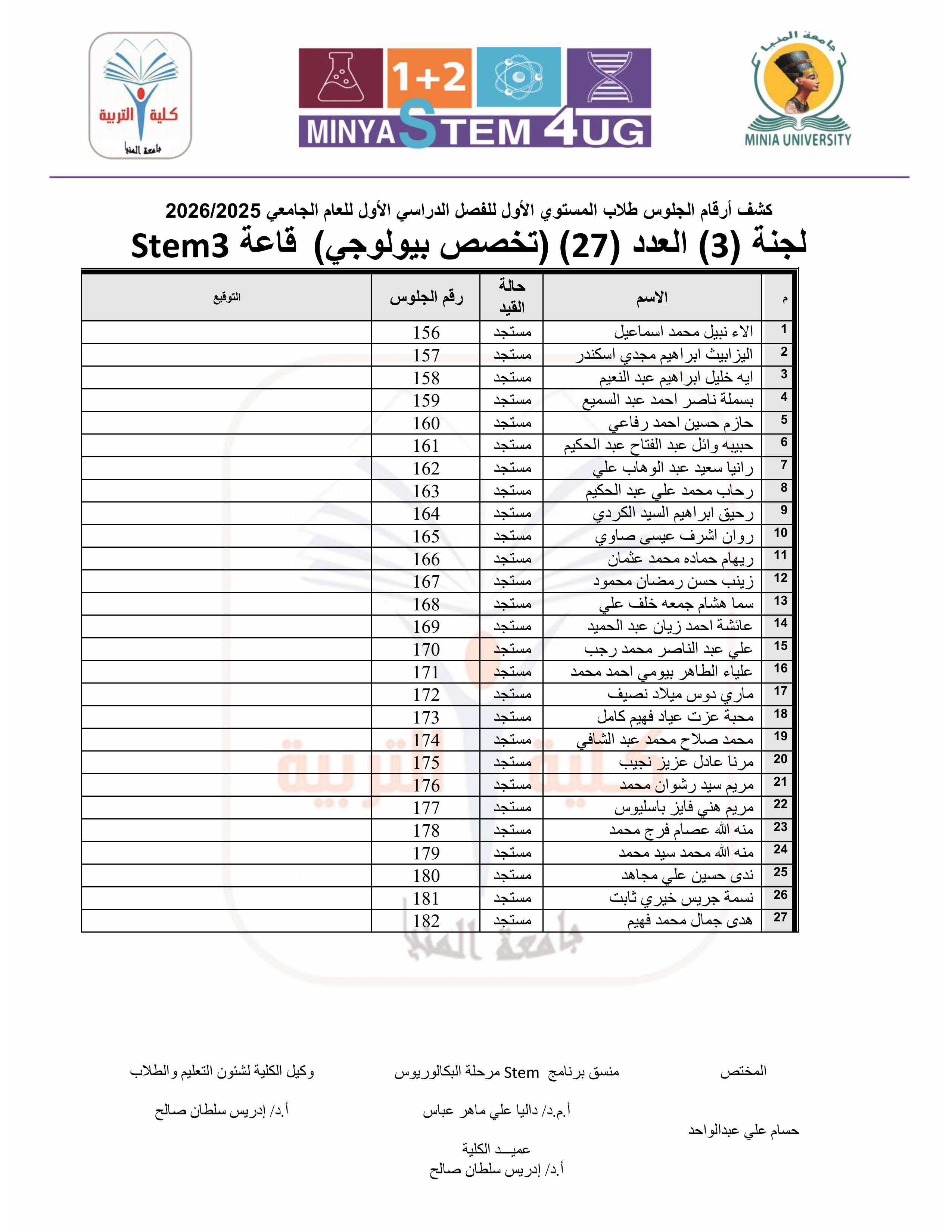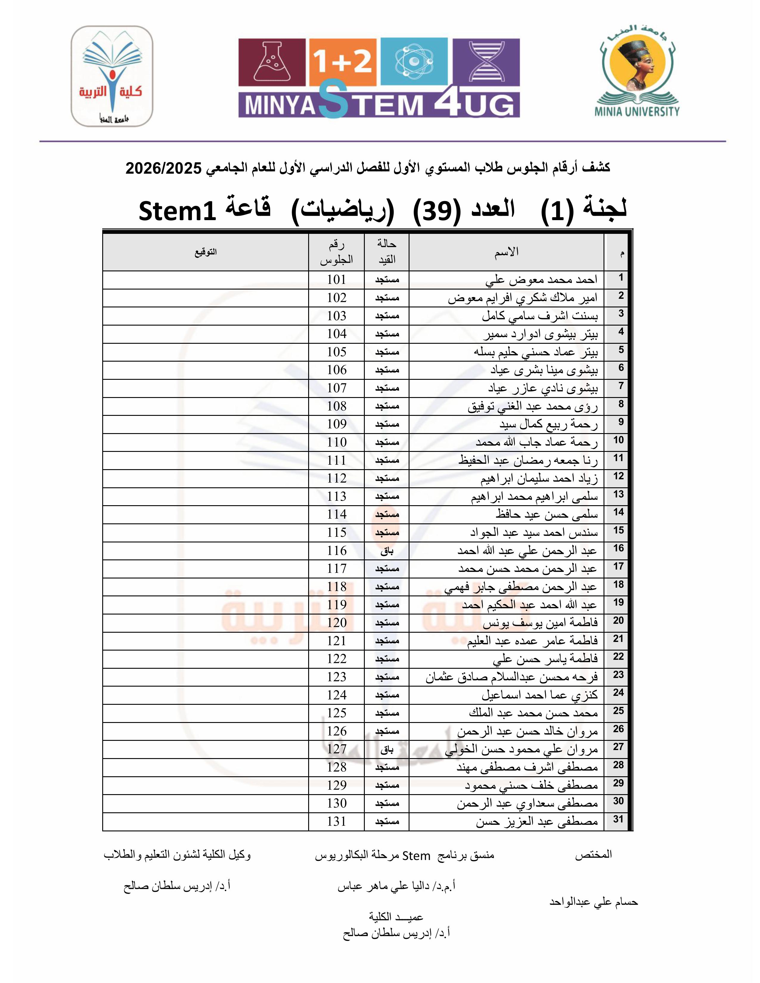 الأبناء الأعزاء طلاب المستوى الاول STEM بكلية التربية، مرفق لكم رابط أرقام الجلوس وأماكن اللجان لامتحانات الفصل الدراسي الأول للعام ٢٠٢٥ / ٢٠٢٦م.