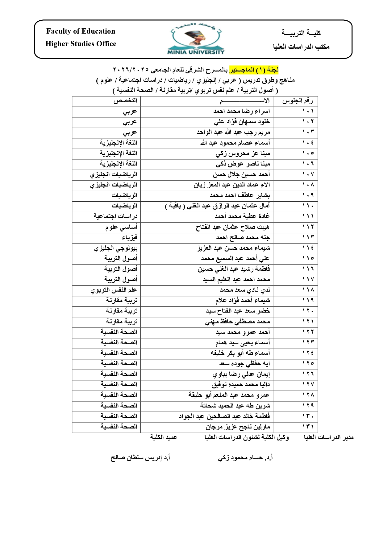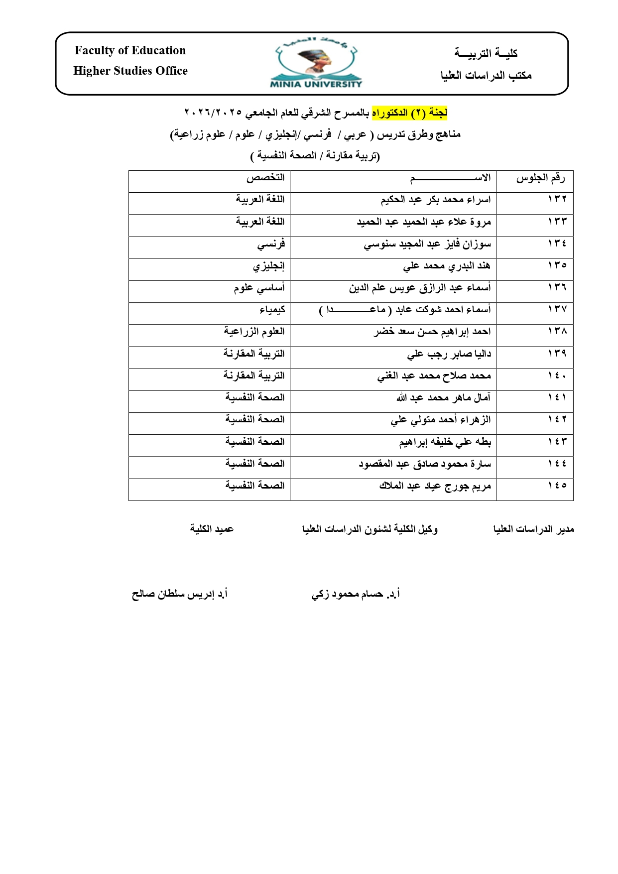 لجان وأماكن الاختبارات النهائية لطلاب الماجستير والدكتوراه بالكلية الفصل الدراسي الأول 2025/ 2026