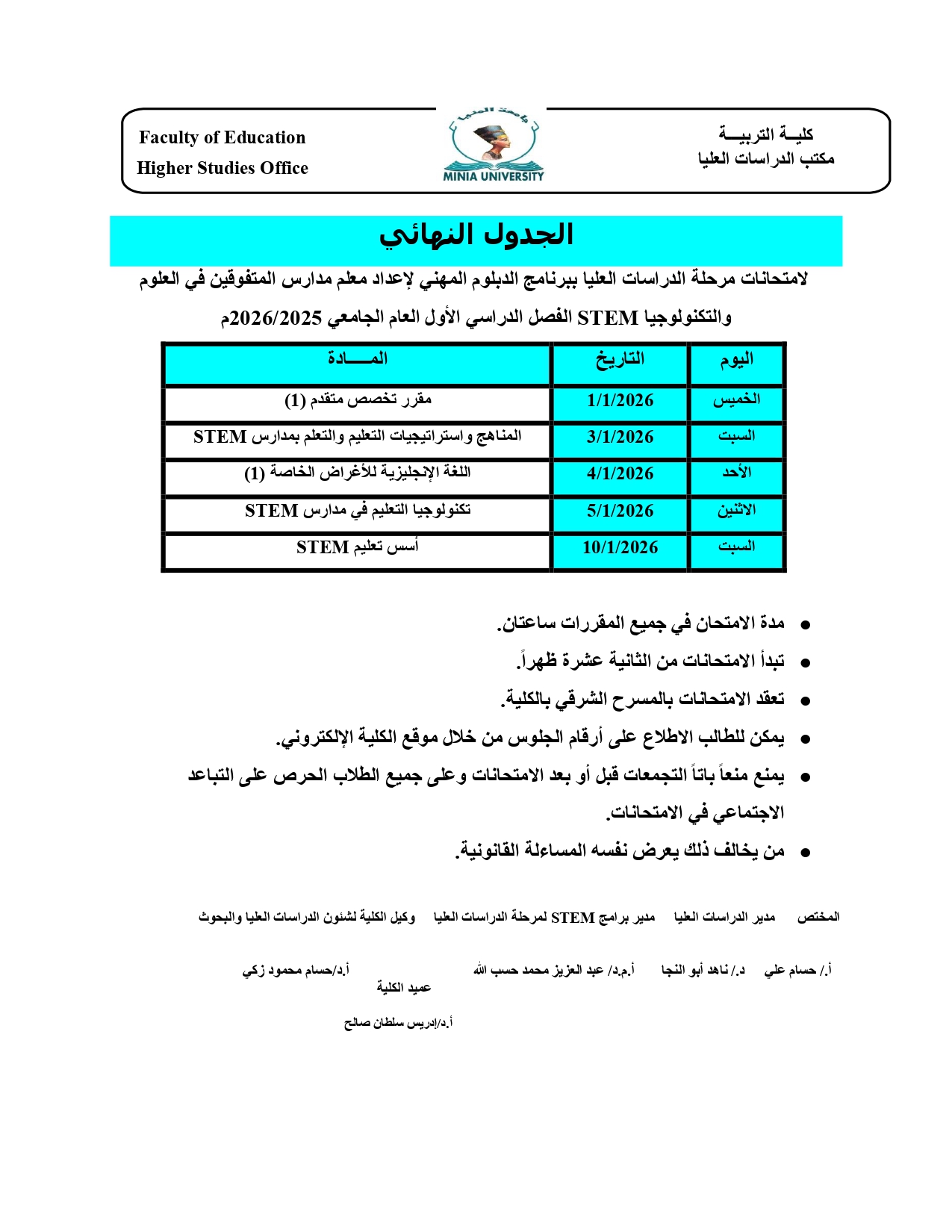 الجدول النهائي لاختبارات طلاب الدراسات العليا _ الدبلوم المهني STEM الفصل الأول للعام الدراسي ٢٠٢٥ /٢٠٢٦ م