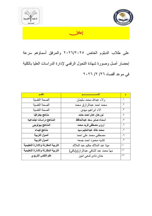 على طلاب الدبلوم الخاص 2025/2026 والمرفق أسماؤهم سرعة إحضار أصل وصورة شهادة التحول الرقمي لإدارة الدراسات العليا بالكلية في موعد أقصاه 26/ 2/ 2026