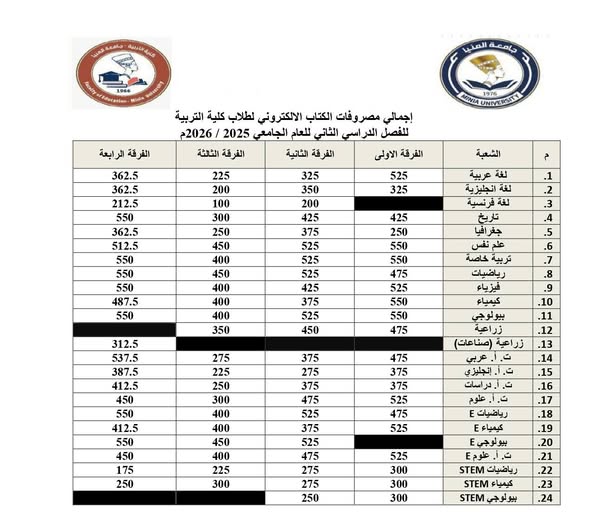 إعلان مصروفات الكتاب الإلكتروني لطلاب كلية التربية، الفصل الدراسي الثانى من العام الجامعي 2026/2025