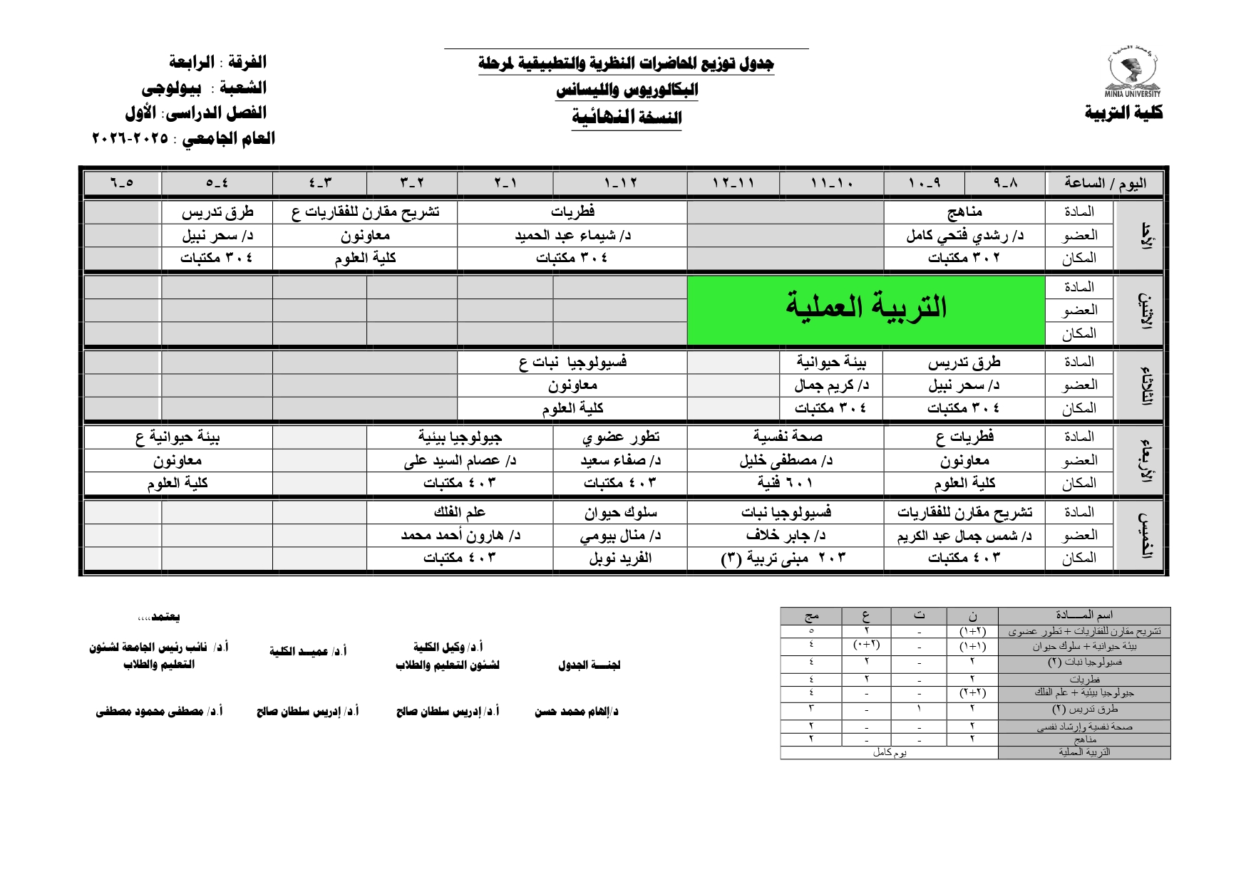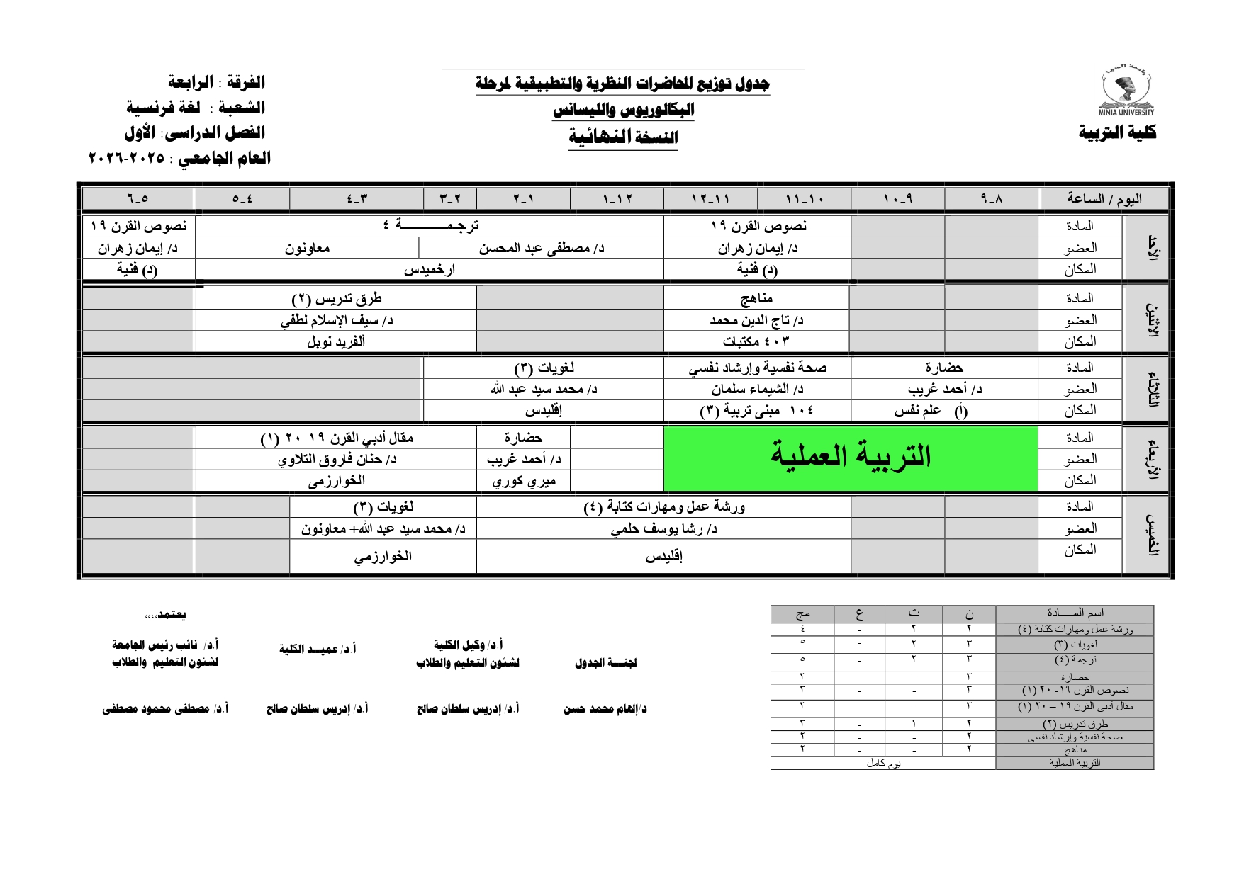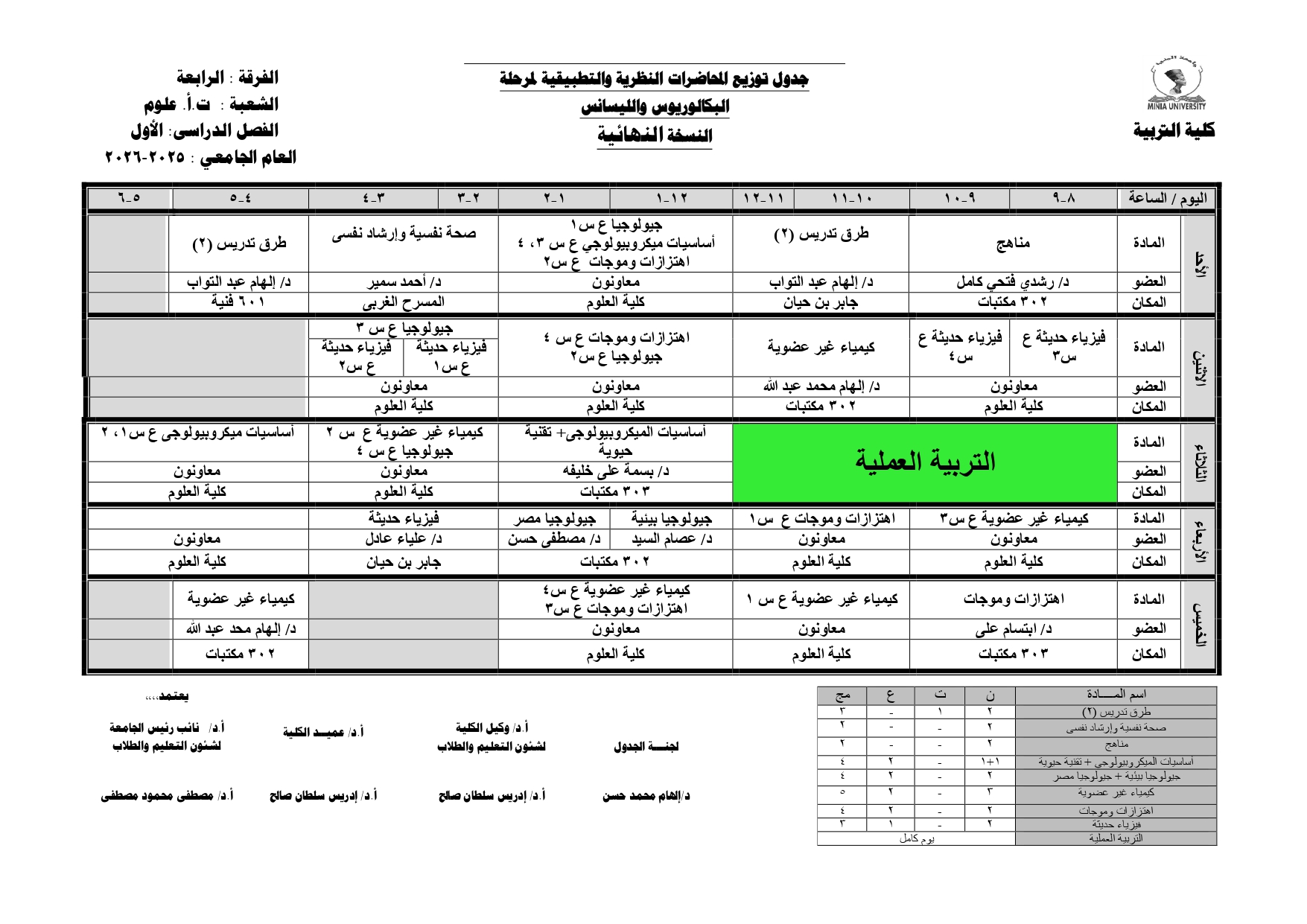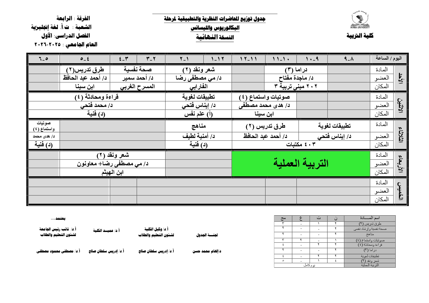 Chers étudiants de la quatrième année, Voici les horaires des cours théoriques et pratiques du premier semestre pour l'Année Académique 2025/2026.