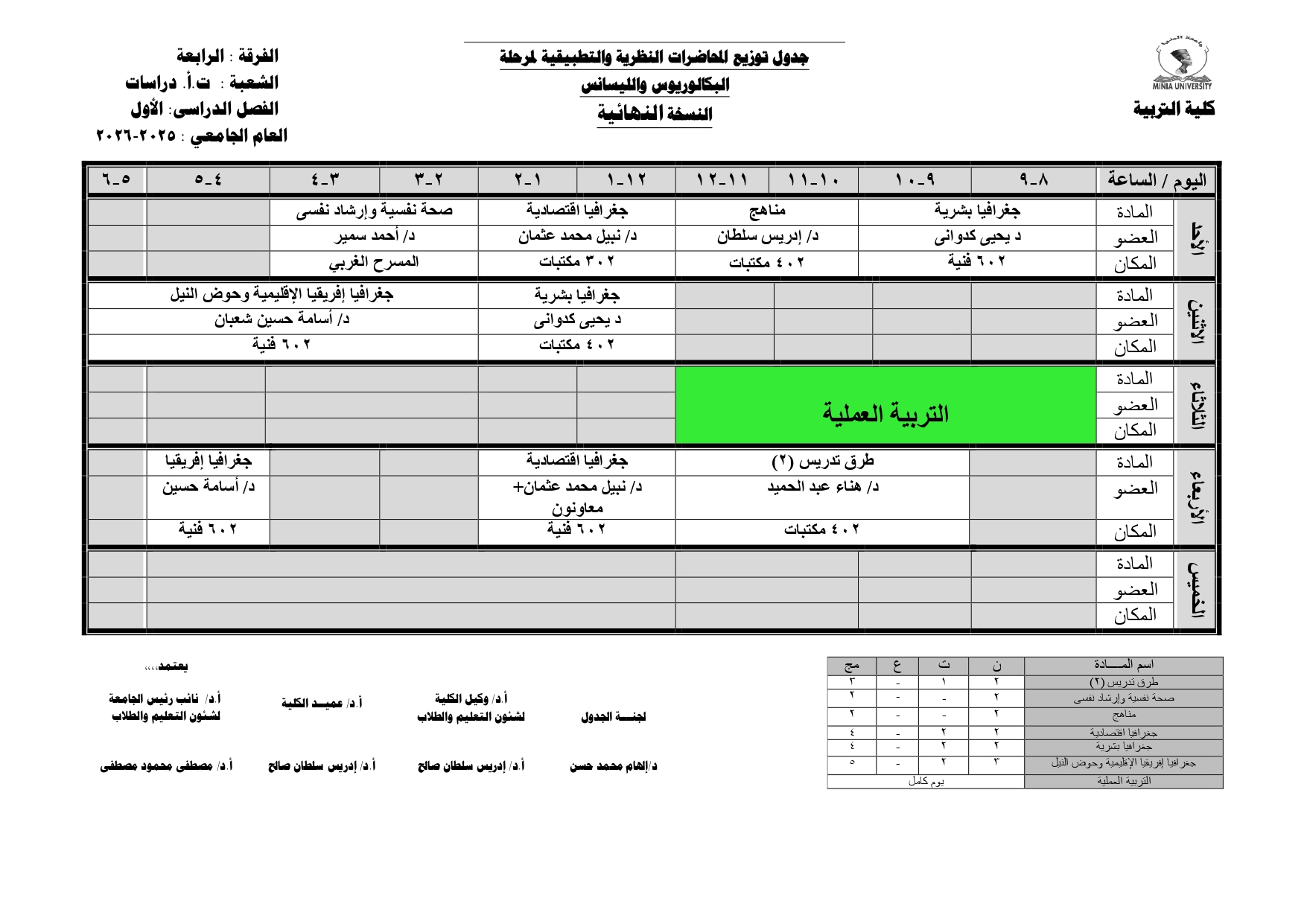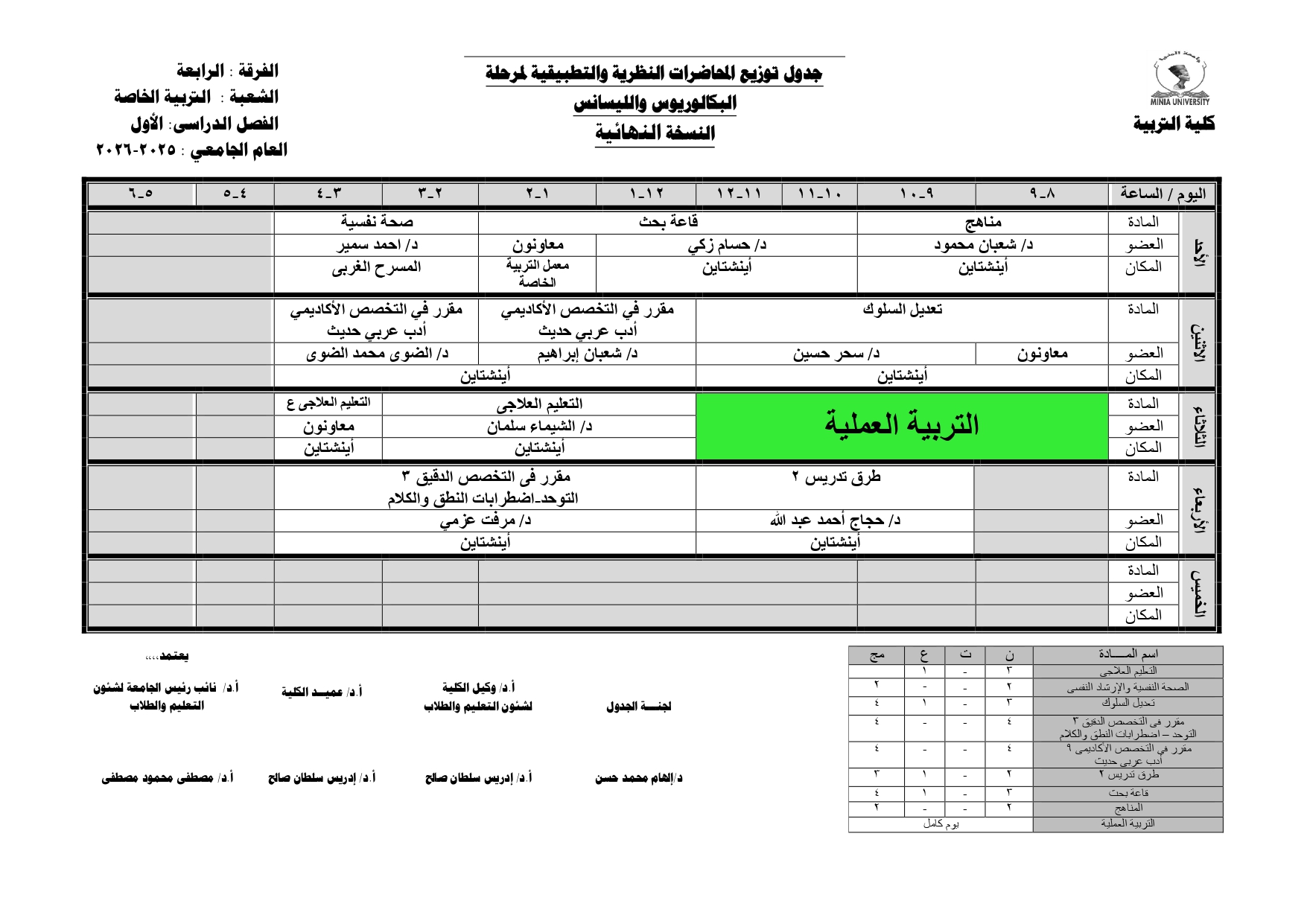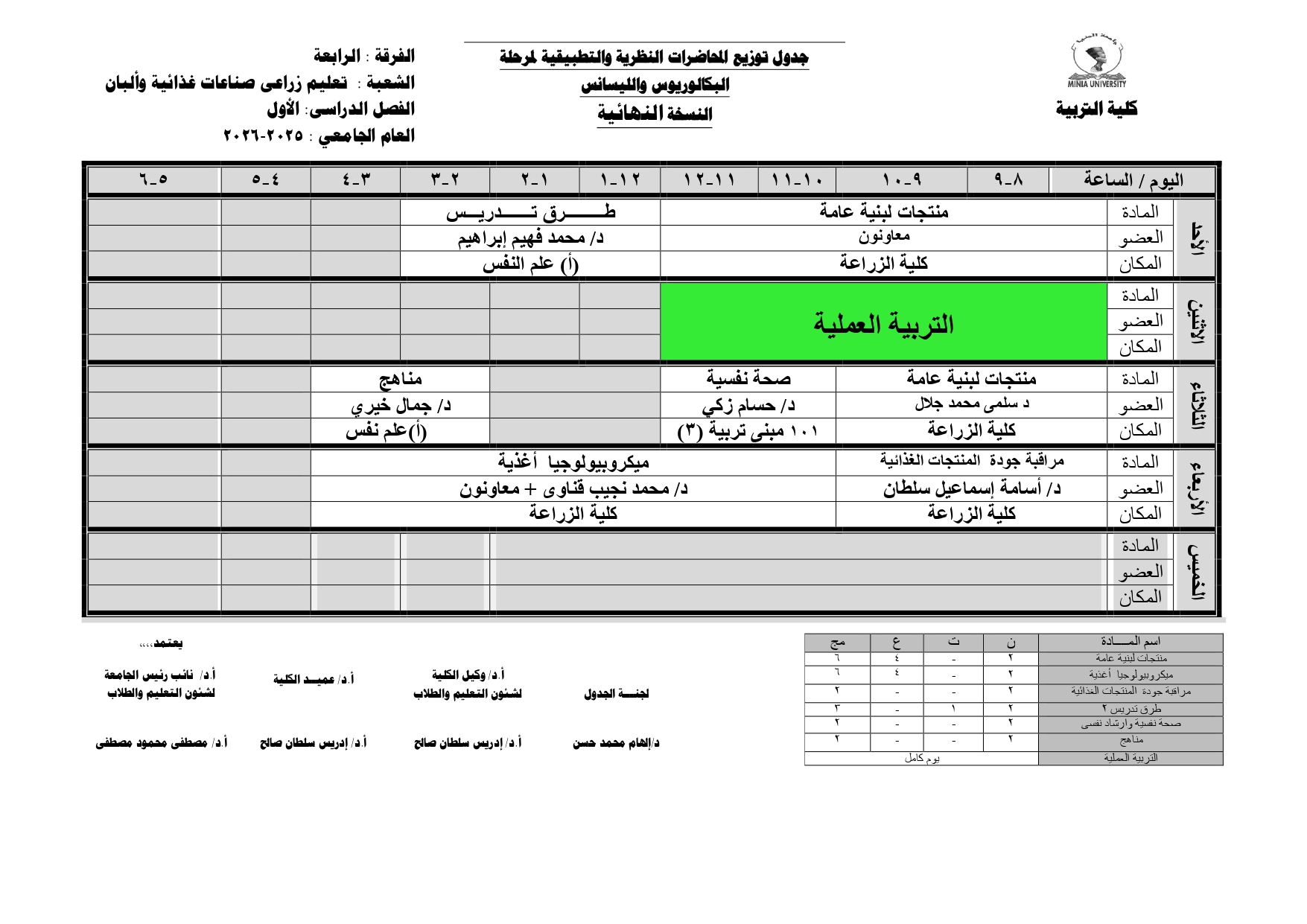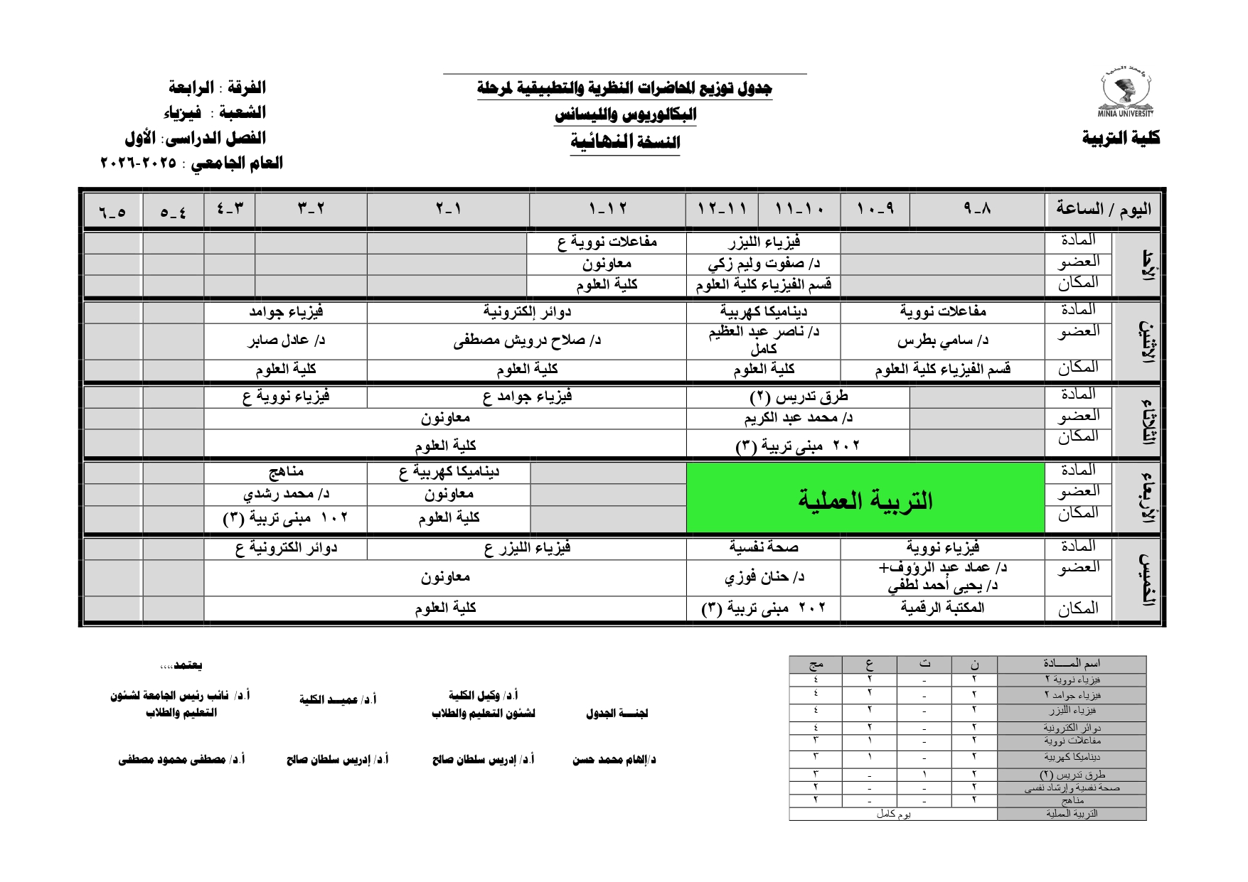 Chers étudiants de la quatrième année, Voici les horaires des cours théoriques et pratiques du premier semestre pour l'Année Académique 2025/2026.