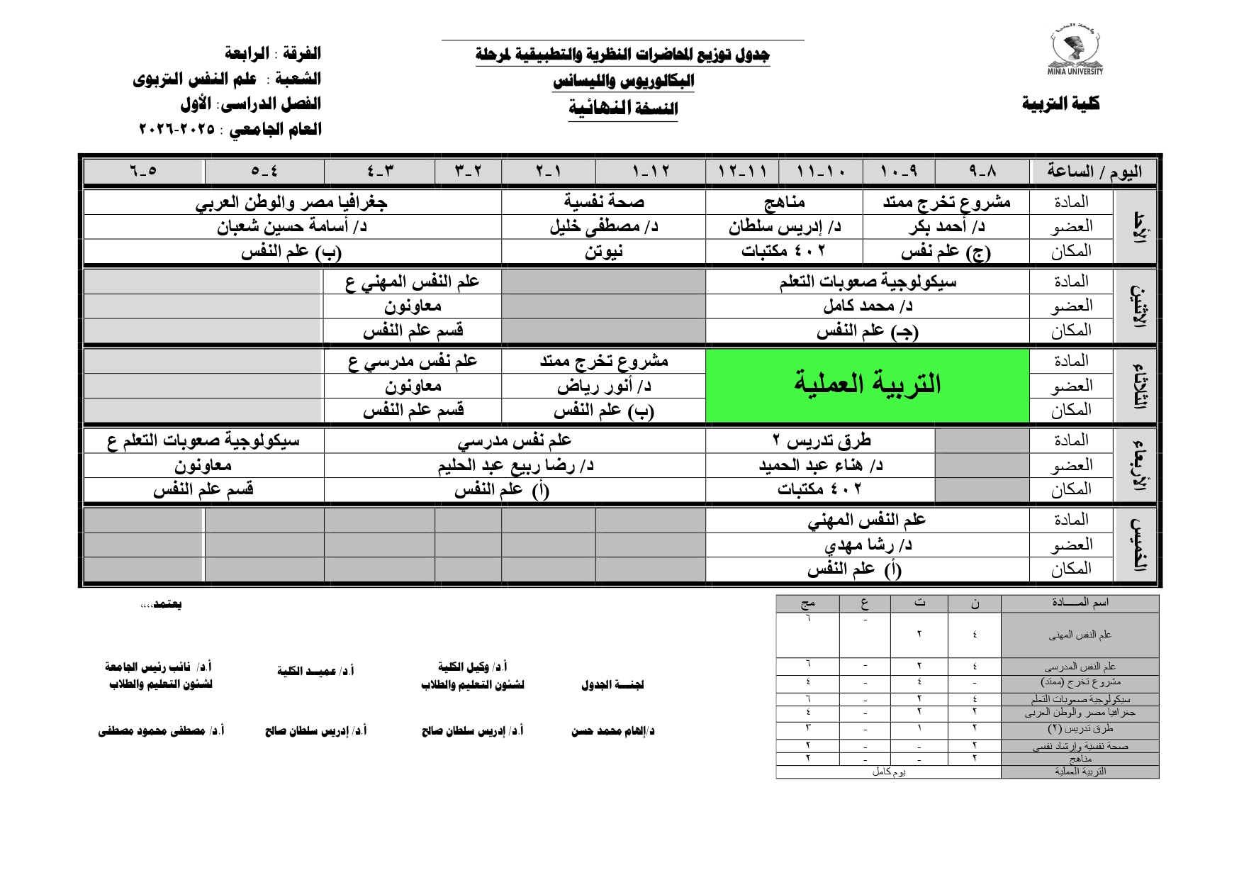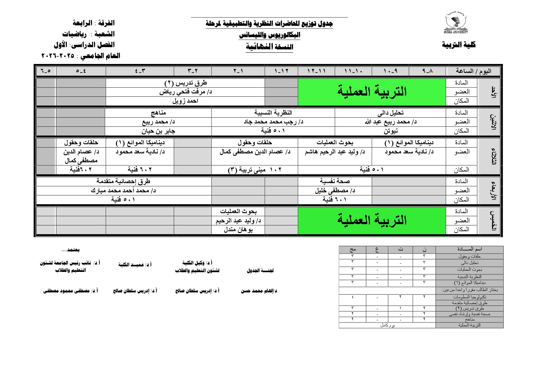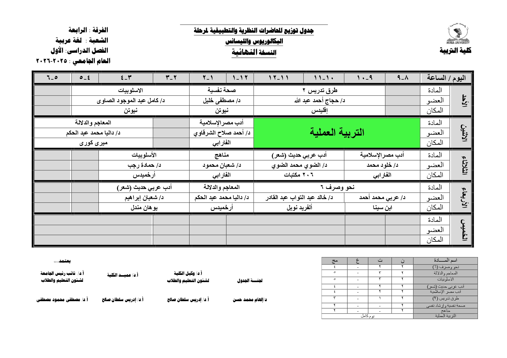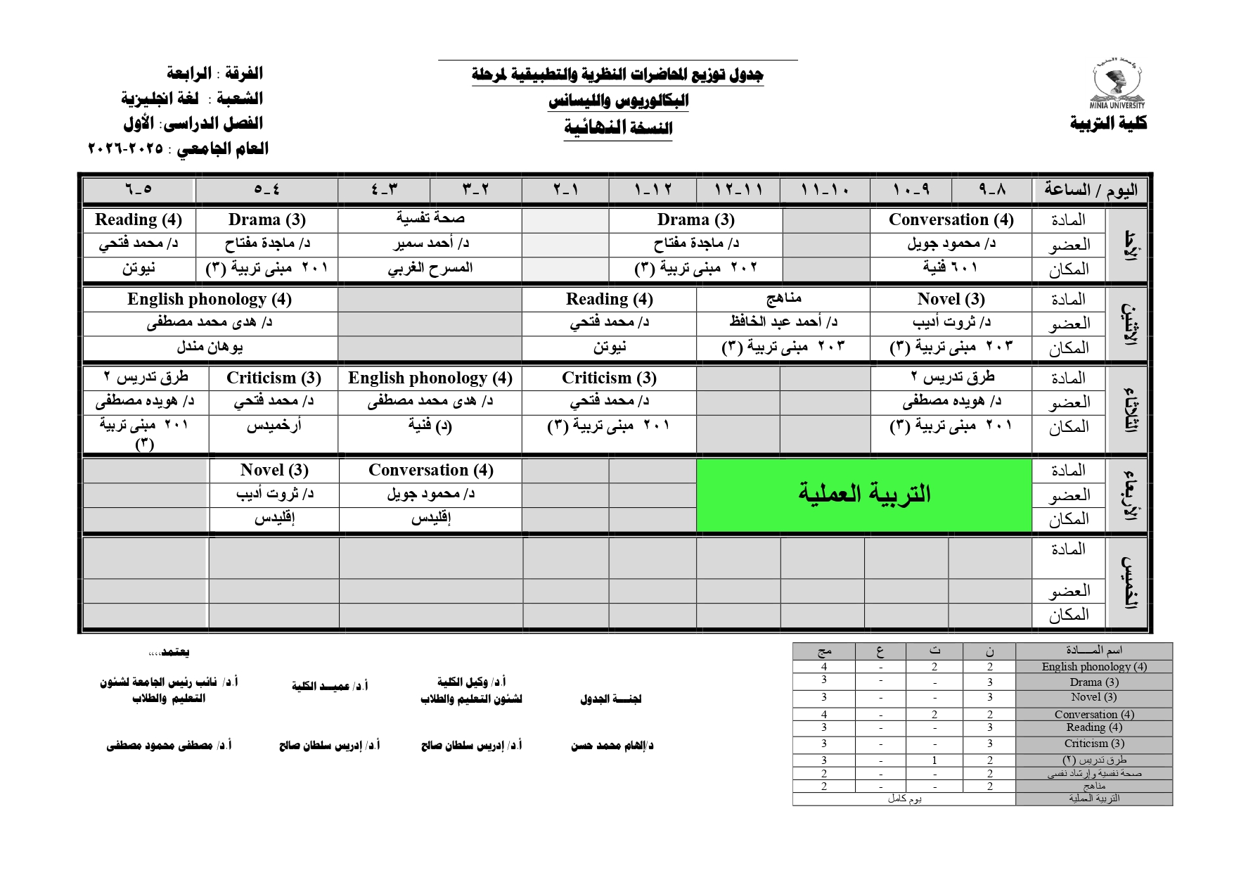 Chers étudiants de la quatrième année, Voici les horaires des cours théoriques et pratiques du premier semestre pour l'Année Académique 2025/2026.