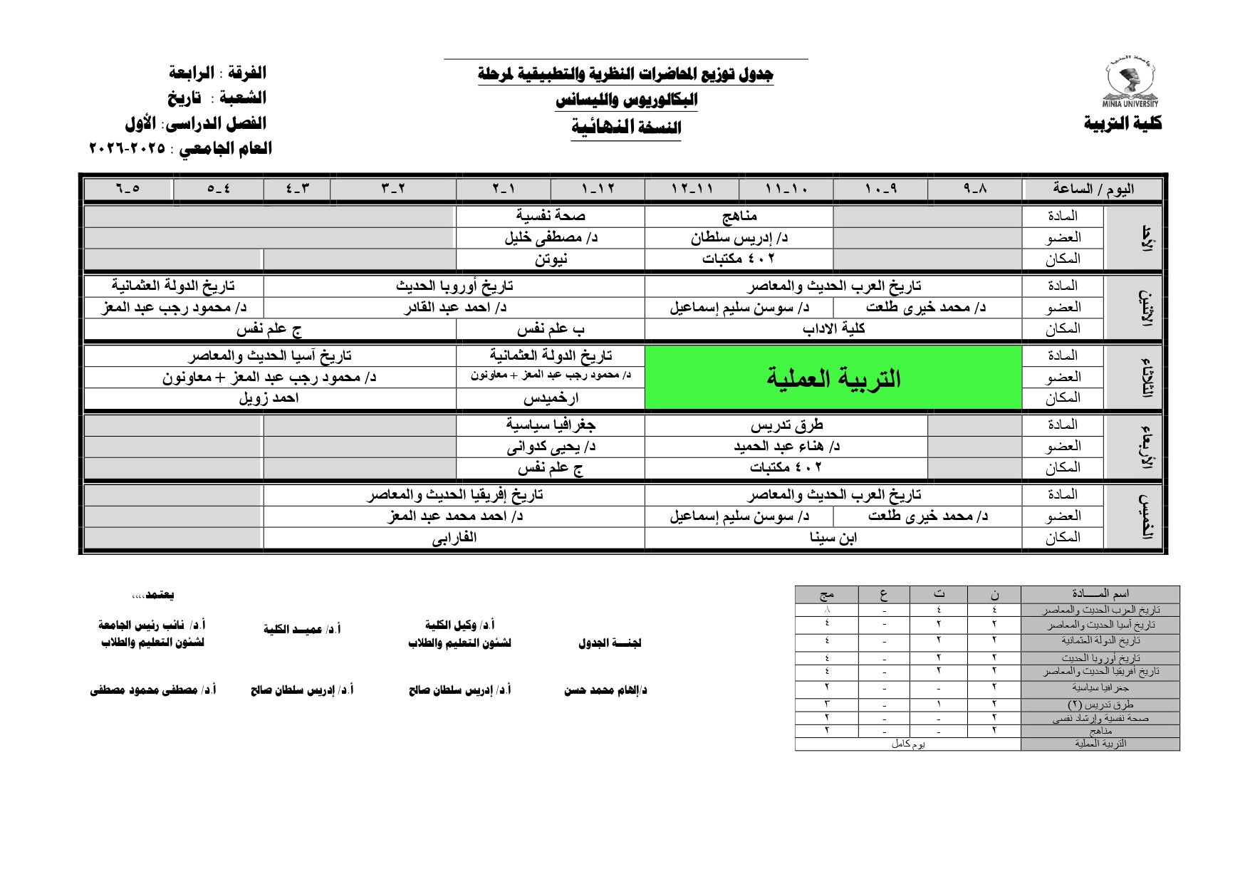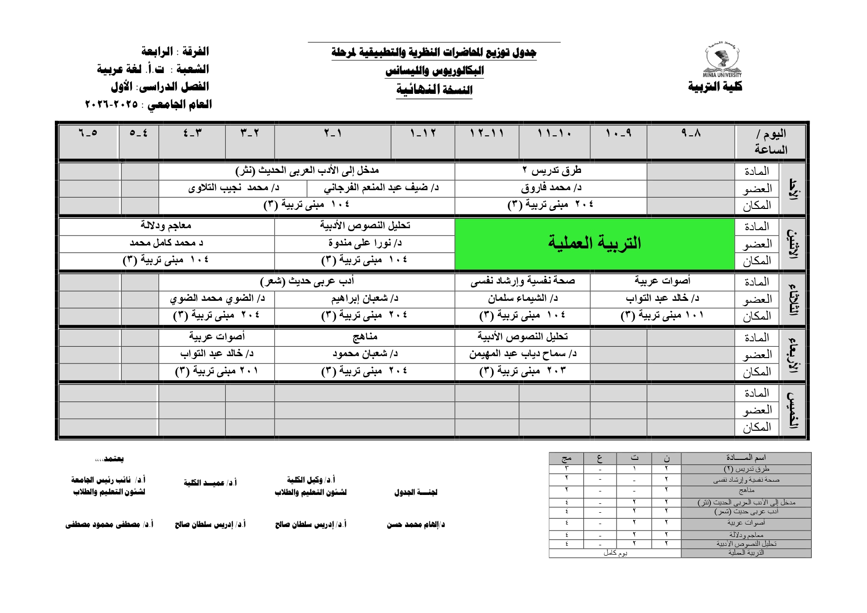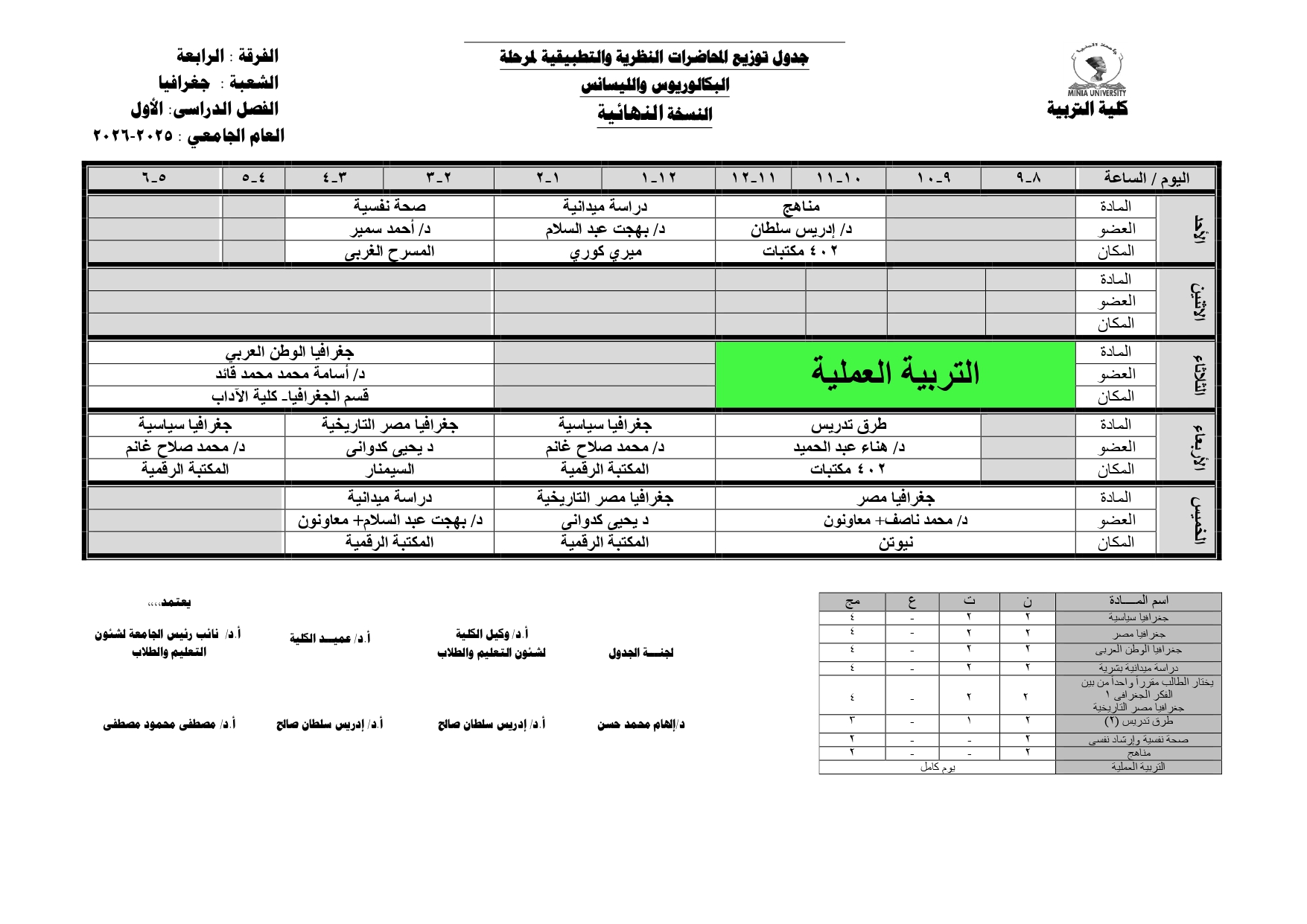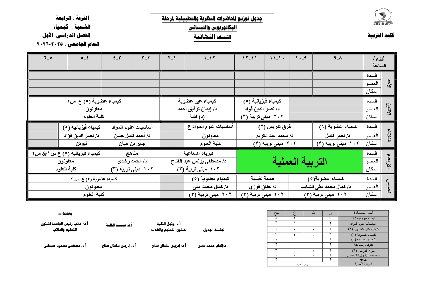 Chers étudiants de la quatrième année, Voici les horaires des cours théoriques et pratiques du premier semestre pour l'Année Académique 2025/2026.
