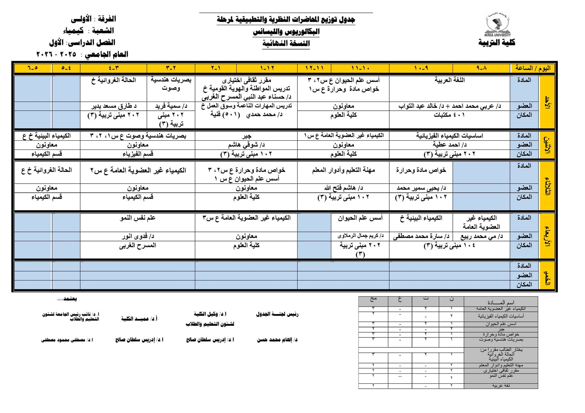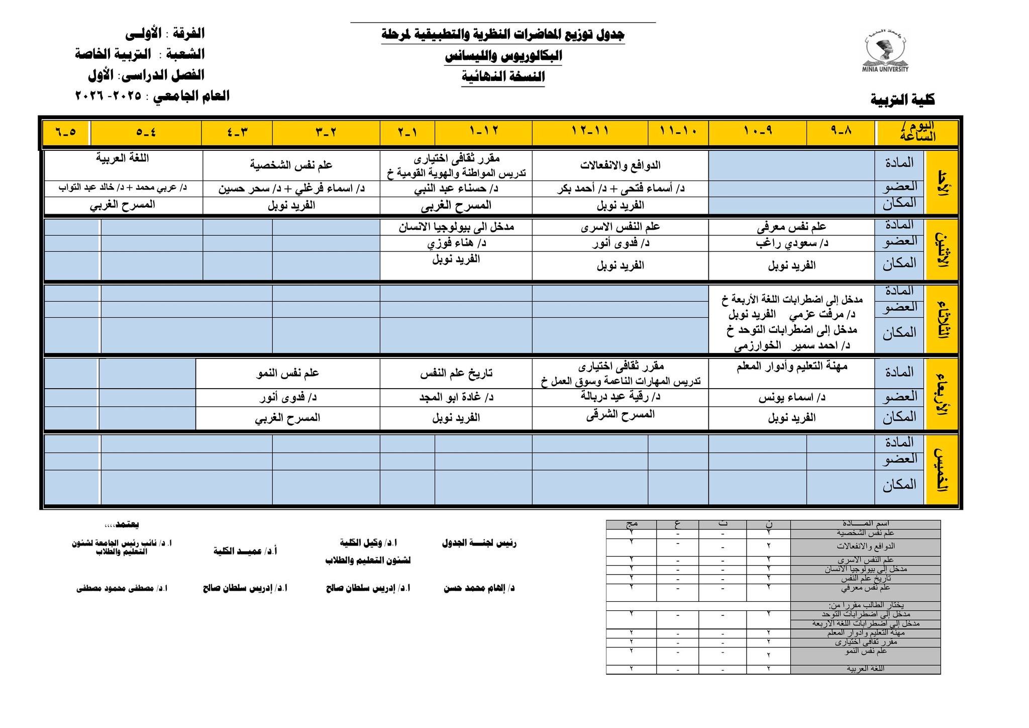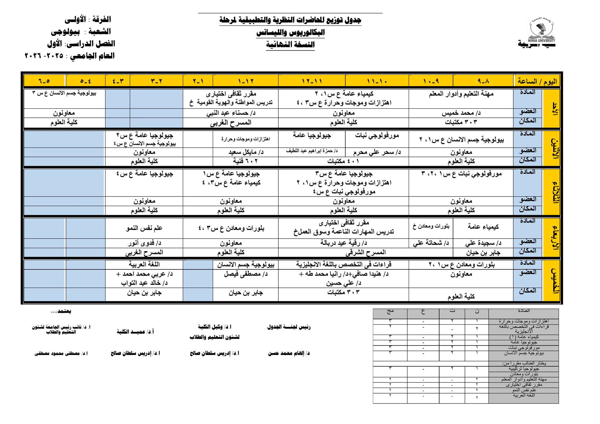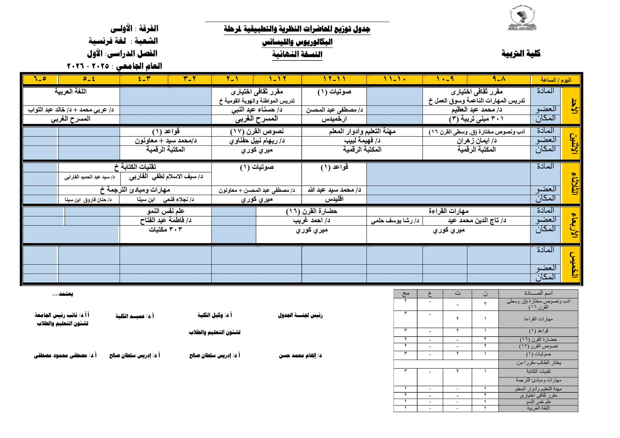 Chers étudiants de la première année, Voici les horaires des cours théoriques et pratiques du premier semestre pour l'Année Académique 2025/2026.