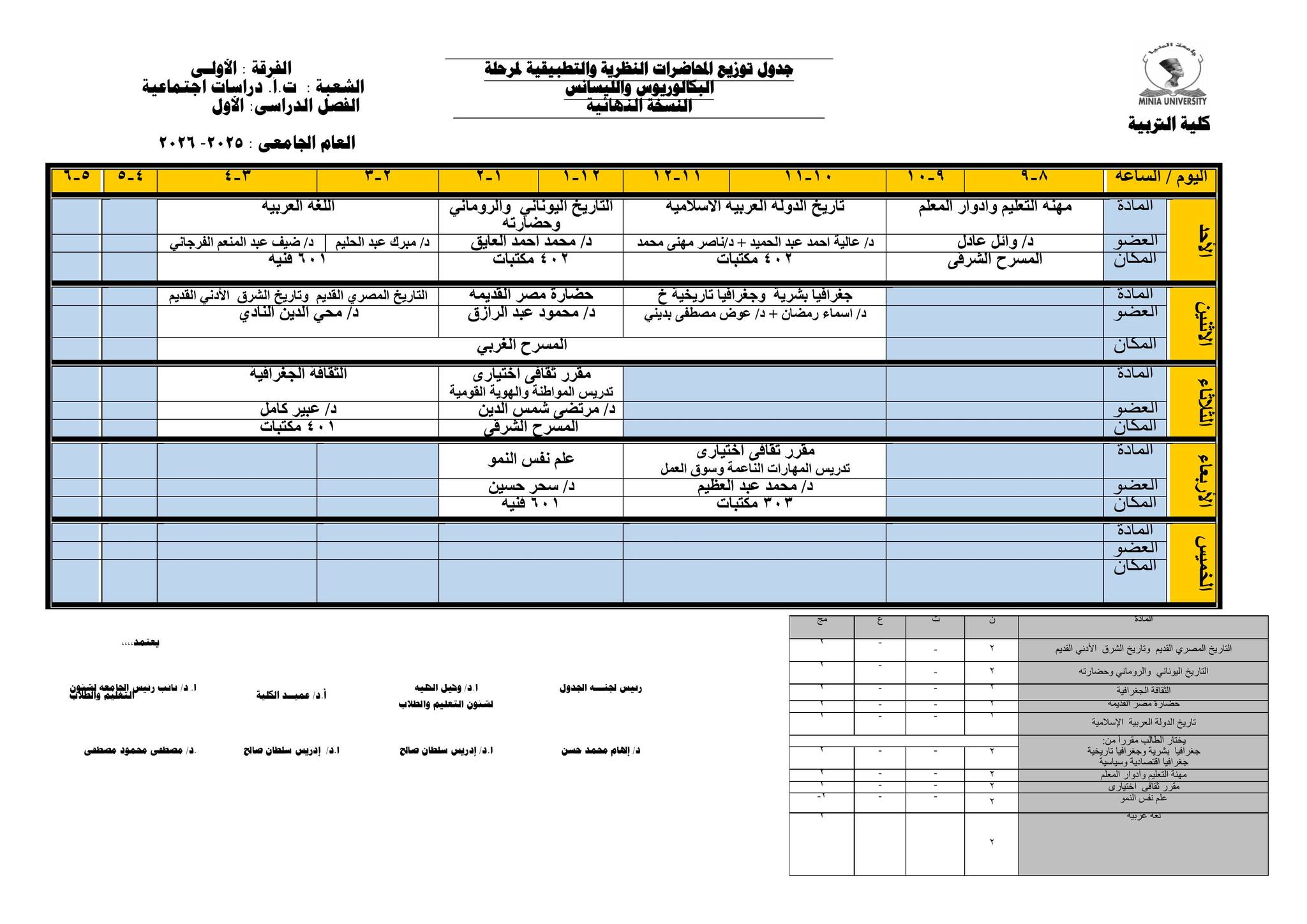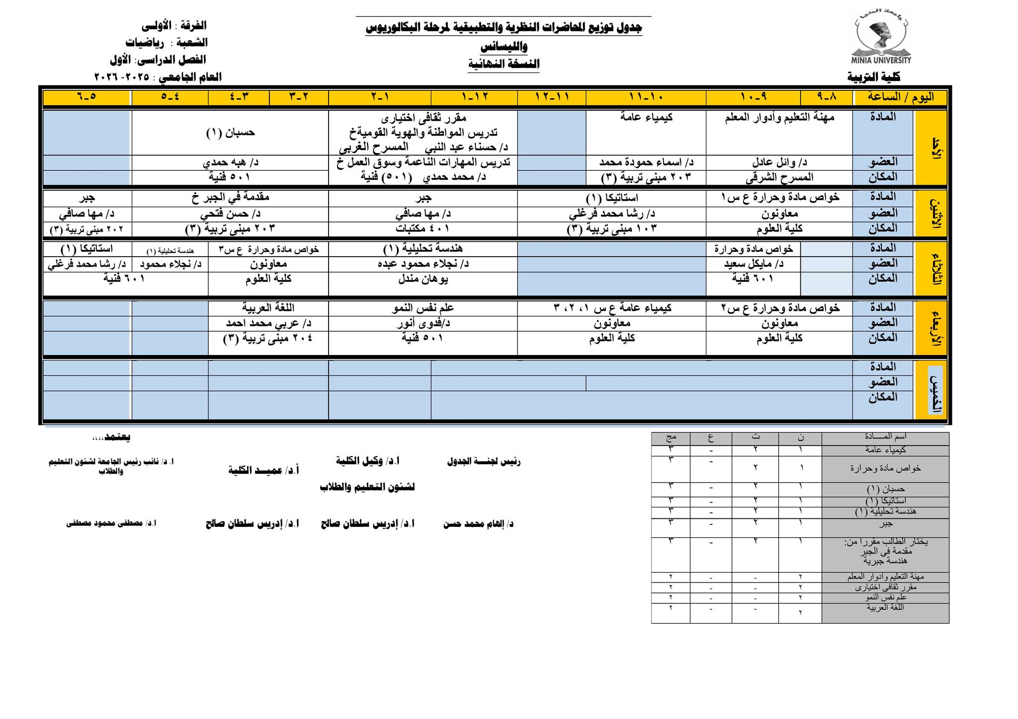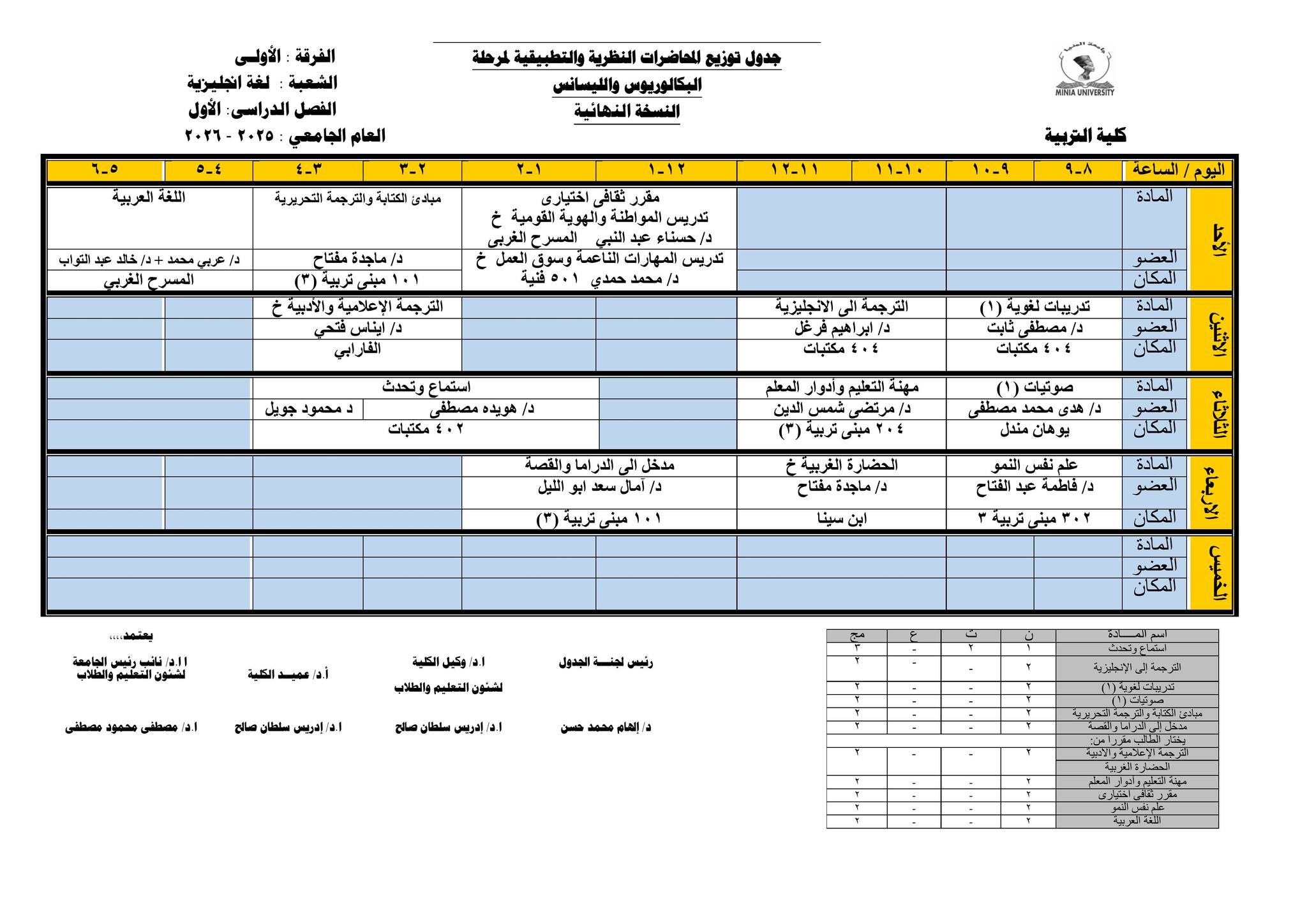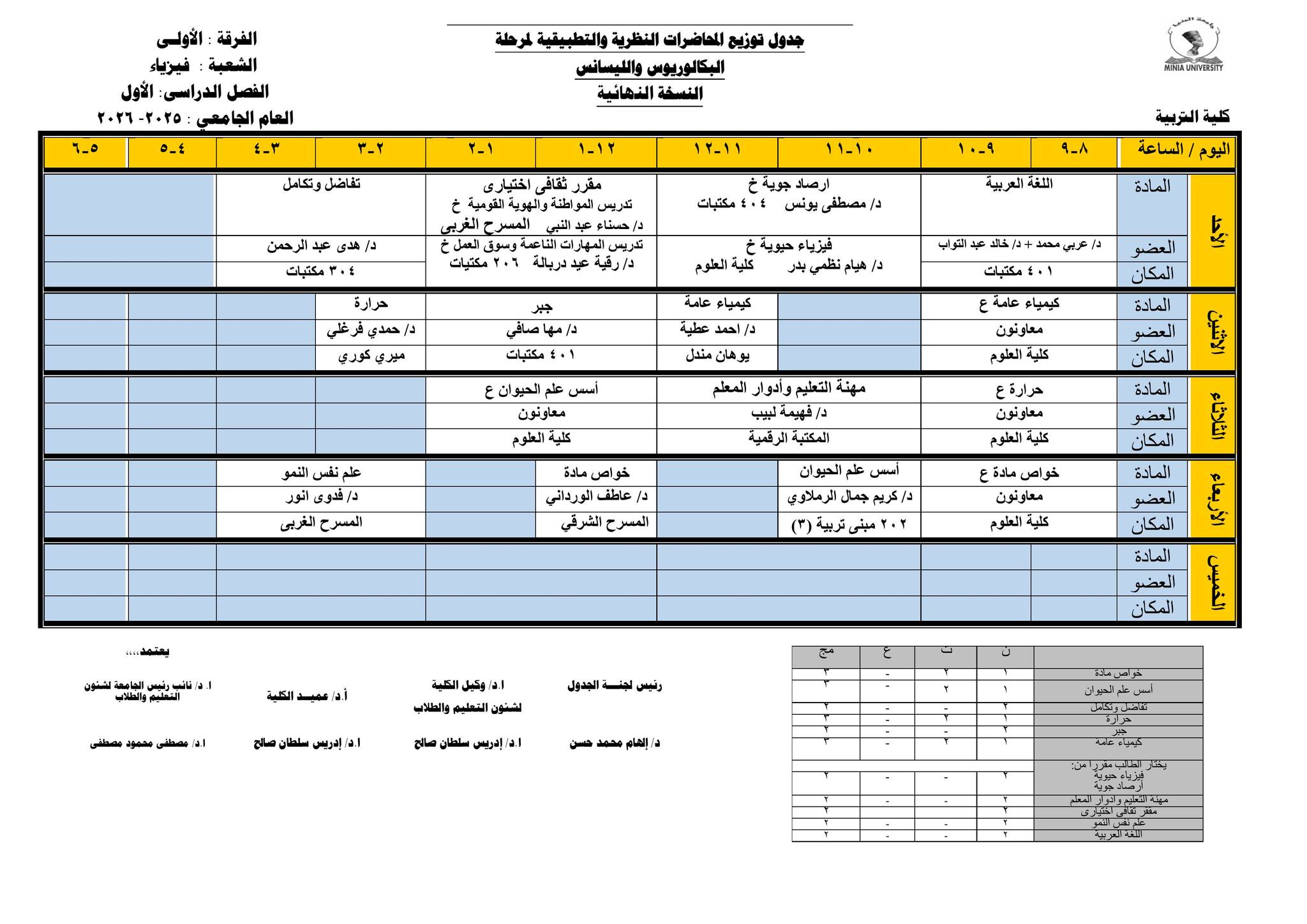 Chers étudiants de la première année, Voici les horaires des cours théoriques et pratiques du premier semestre pour l'Année Académique 2025/2026.