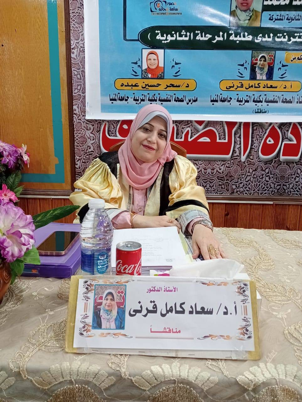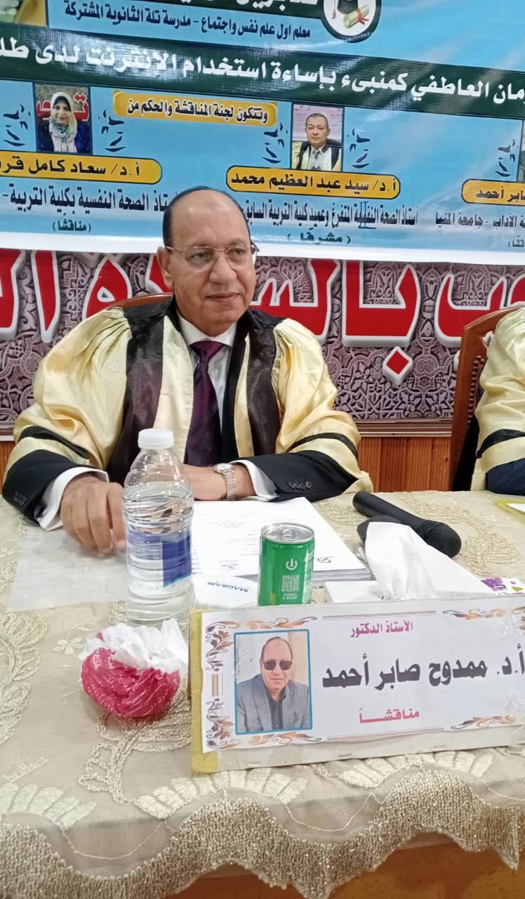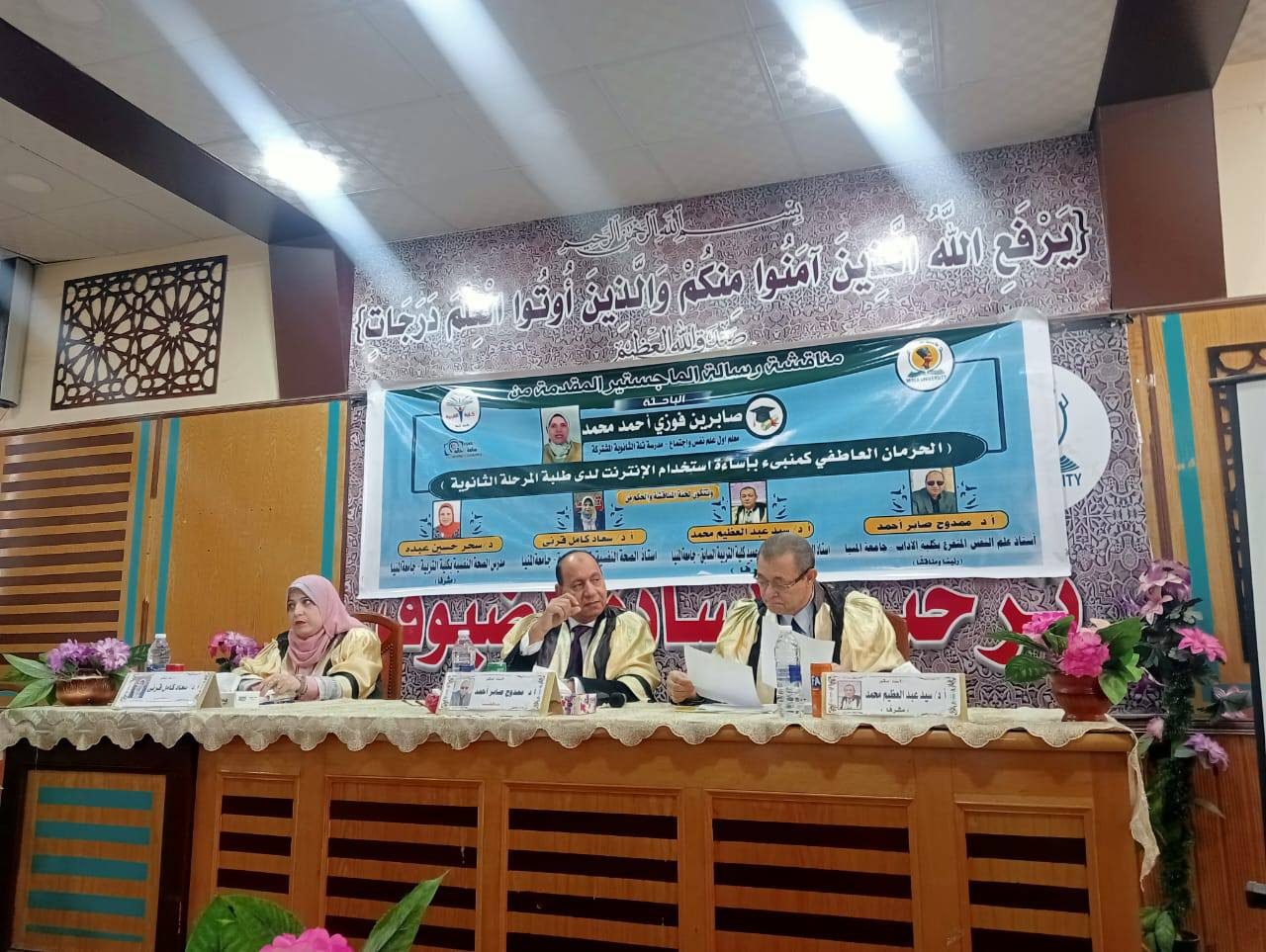 Le Mercredi 19 Novembre 2025, Soutenance de la thèse de Magistère présentée par la chercheuse/ Sabreen Fawzy Ahmed Muhammad s'est tenue à 10h00 à la salle de discussions à la Faculté au bâtiment de la bibliothèque au premier étage, et le jury de soutenance a octroyé la chercheuse le grade de Magistère (la spécialisation: Santé Psychologique).