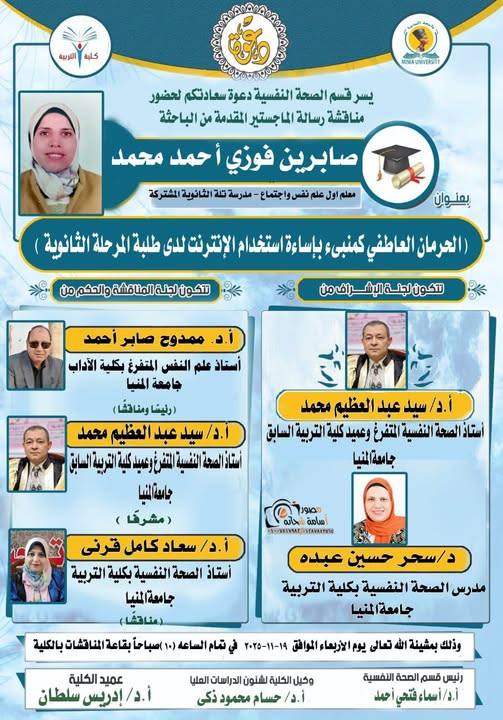 مناقشة رسالة الماجستير المقدمة من الباحثة/ صابرين فوزي أحمد " قسم الصحة النفسية "