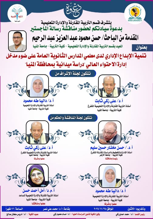 مناقشة رسالة الماجستير المقدمة من الباحث / حسن محمود عبدالعزيز عبدالرحيم المعيد بقسم التربية المقارنة والادارة التعليمية - كلية التربية - جامعة المنيا