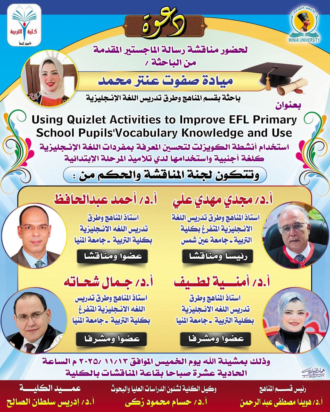 دعوة لحضور مناقشة رسالة الماجستير المقدمة من الباحثة / ميادة صفوت عنتر محمد باحثة بقسم المناهج وطرق تدريس اللغة الانجليزية